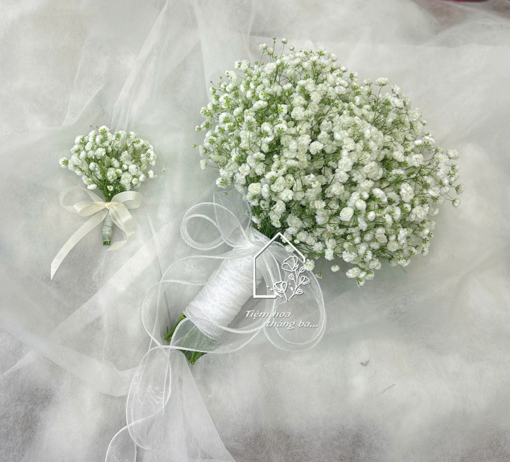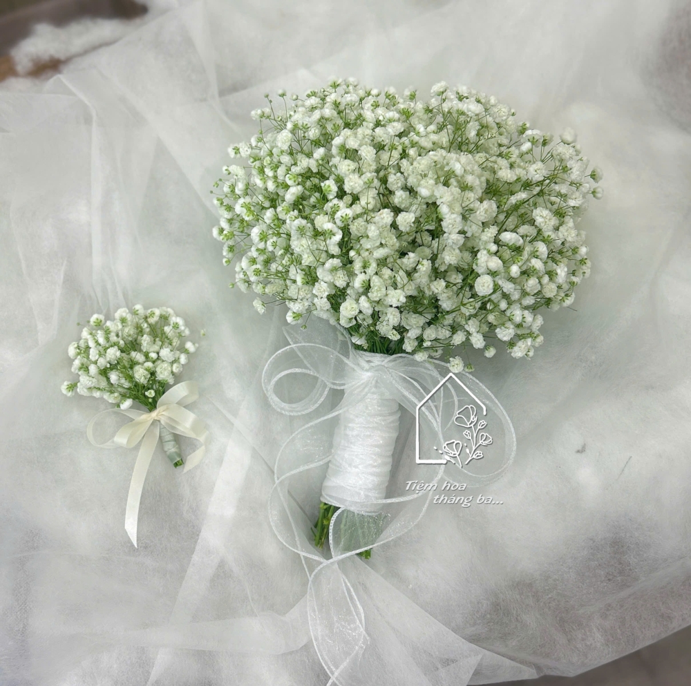 Tại Tiệm Hoa Tháng Ba, bó hoa cưới baby trắng được thiết kế thủ công tỉ mỉ từ hoa baby nhập khẩu chất lượng cao, bông đều, nở đẹp và giữ form bền suốt buổi lễ. Kiểu dáng bó tròn cổ điển hoặc bó dài tự nhiên giúp tôn lên vẻ đẹp thanh thoát của váy cưới, làm nổi bật thần thái dịu dàng và nữ tính của cô dâu.