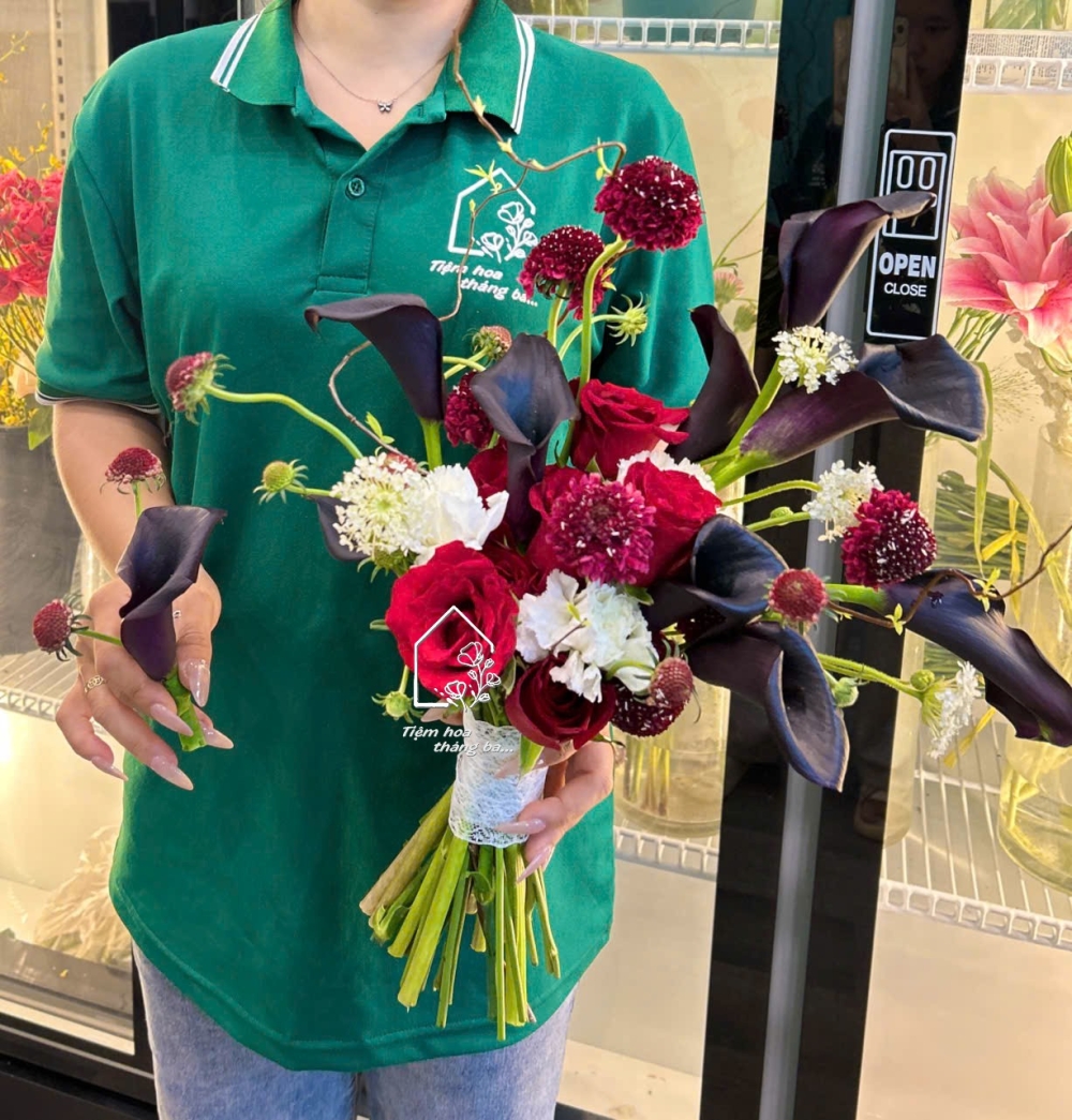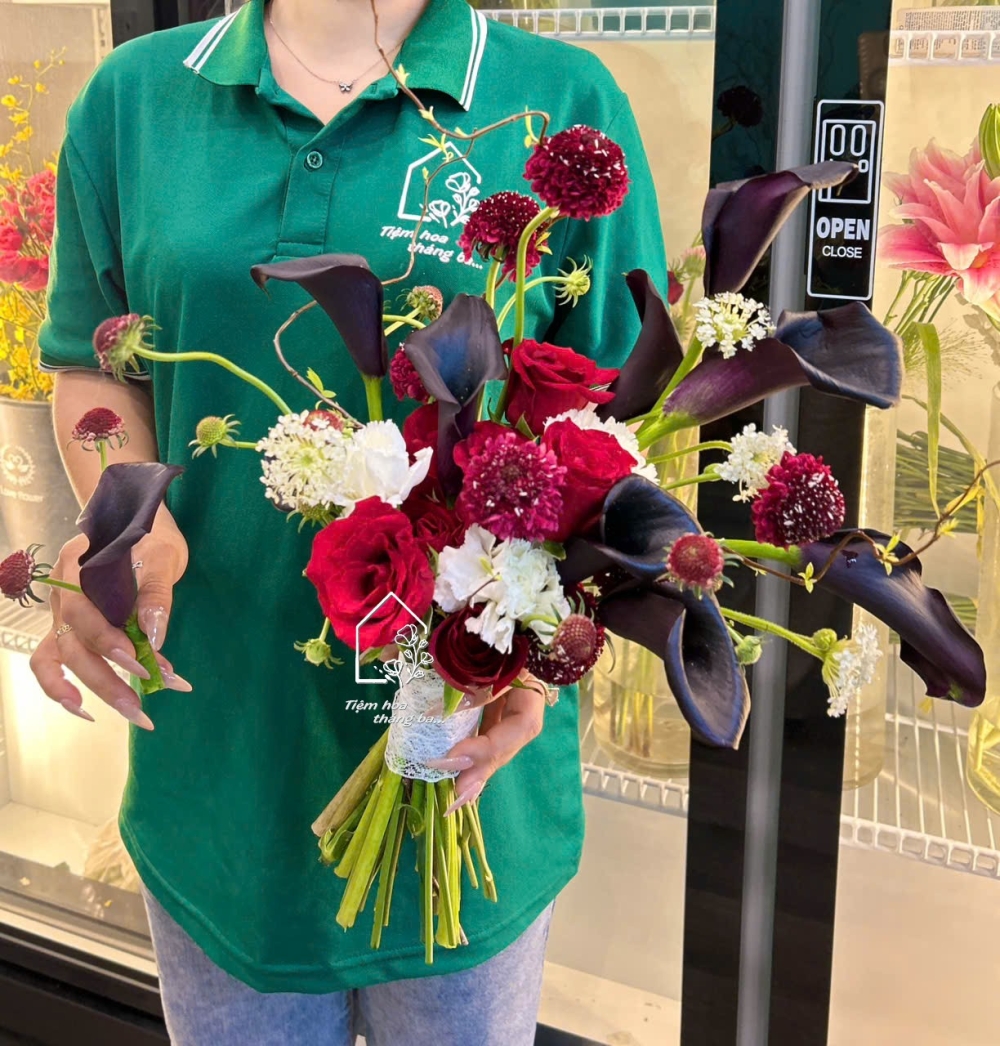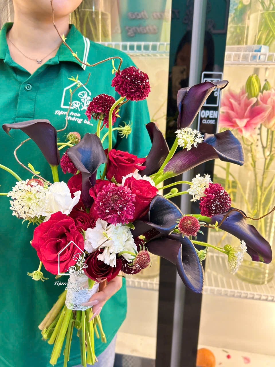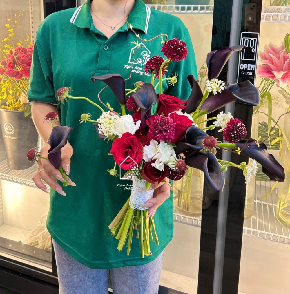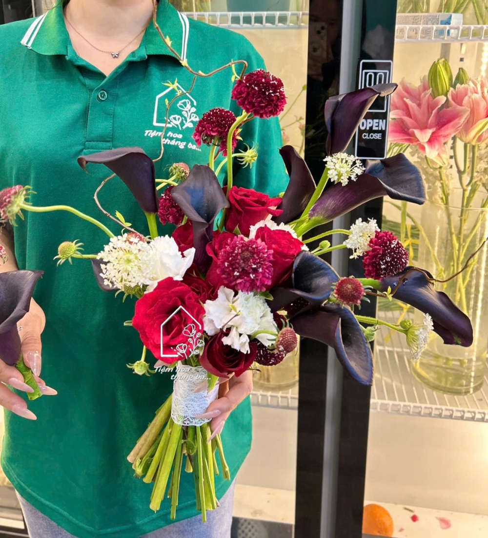 Bó hoa cưới là sự kết hợp ấn tượng giữa sắc đỏ nồng nàn của hoa hồng và sắc đen huyền bí của calla – tạo nên một tổng thể đầy chiều sâu và cá tính. Không quá rực rỡ theo cách quen thuộc, nhưng lại cuốn hút theo một cách rất riêng.