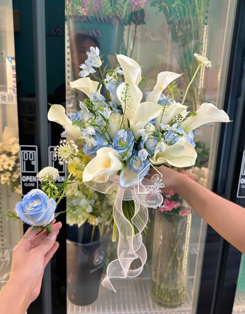 Bó hoa cưới rum trắng mix xanh dương nổi bật với vẻ đẹp thuần khiết và tinh tế, tượng trưng cho sự khởi đầu mới đầy yêu thương và bền vững. Hoa rum trắng thanh thoát được phối hài hòa cùng sắc xanh dương dịu mát, tạo nên tổng thể trang nhã, sang trọng nhưng không kém phần cuốn hút.