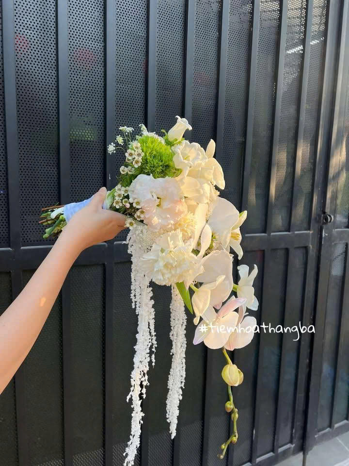 Bó hoa cưới tone trắng thanh khiết là lựa chọn lý tưởng cho những cô dâu yêu sự tinh tế và thuần khiết. Sắc trắng dịu dàng của lan hồ điệp hòa cùng nét mềm mại của hoa tulip, dền rủ và cát tường trắng tạo nên một tổng thể hài hòa, thanh thoát và đầy cảm xúc.