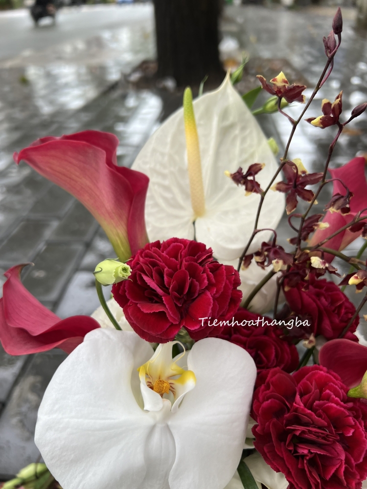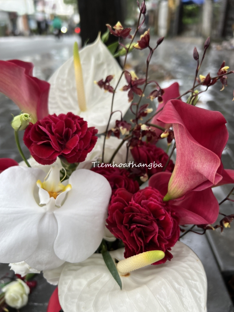 Bó hoa cưới là sự kết hợp giữa sắc đỏ của hoa rum, cẩm chướng, lan vũ nữ và sắc trắng của hoa hồng môn, lan hồ điệp, cát tường mang hơi hướng hiện đại và sang trọng, giúp cô dâu tỏa sáng rạng ngời trong ngày hạnh phúc.