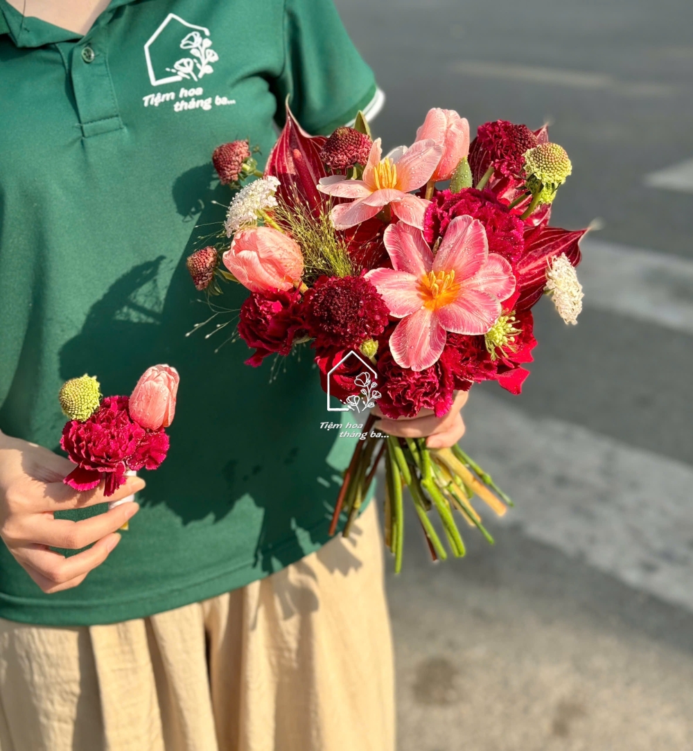 Bó hoa cưới tone hồng đỏ rượu do Tiệm Hoa Tháng Ba thiết kế là bản hòa ca tinh tế giữa sắc đỏ trầm ấm và gam hồng tươi sáng – tượng trưng cho tình yêu nồng nàn, hạnh phúc viên mãn và khởi đầu đầy may mắn cho cuộc sống hôn nhân.