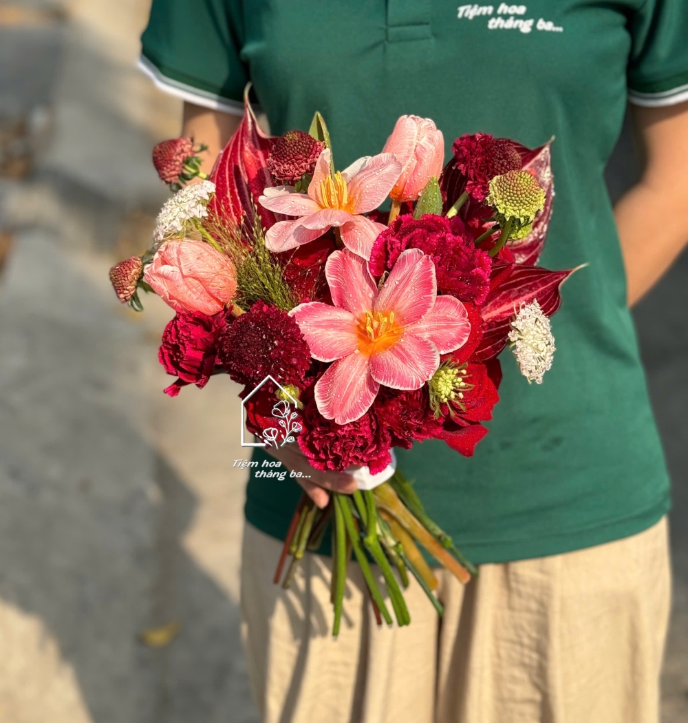 Trung tâm bó hoa là những đóa hoa tulip hồng mềm mại, bung nở đầy sức sống, được phối khéo léo cùng hoa hồng đỏ, cẩm chướng đỏ đô, hồng môn sọc và các loại hoa điểm trắng nhỏ xinh. Xen kẽ là lớp lá và cỏ trang trí tự nhiên, tạo nên bố cục thoáng, có chiều sâu thị giác và mang đậm tinh thần garden style hiện đại.