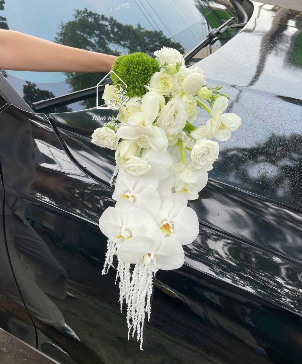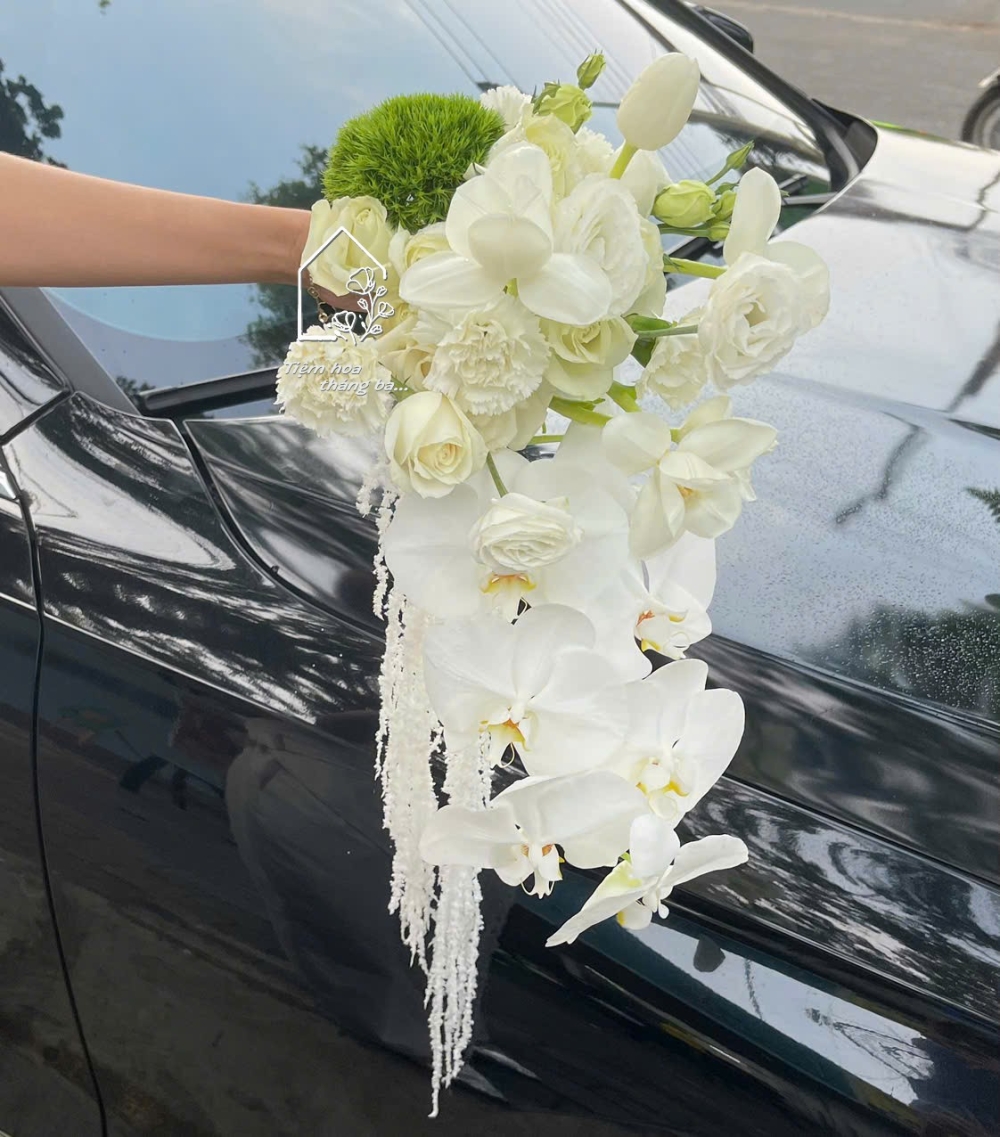 Điểm nổi bật của bó hoa là thiết kế dáng rủ mềm mại, tạo cảm giác nhẹ nhàng, bay bổng theo từng bước chân. Những cành lan hồ điệp trắng nở rộ phía dưới như dòng chảy dịu dàng, kết hợp cùng tulip trắng, hoa hồng trắng và các loại hoa phụ nhỏ xinh giúp tổng thể trở nên hài hòa, sang trọng mà không quá cầu kỳ.