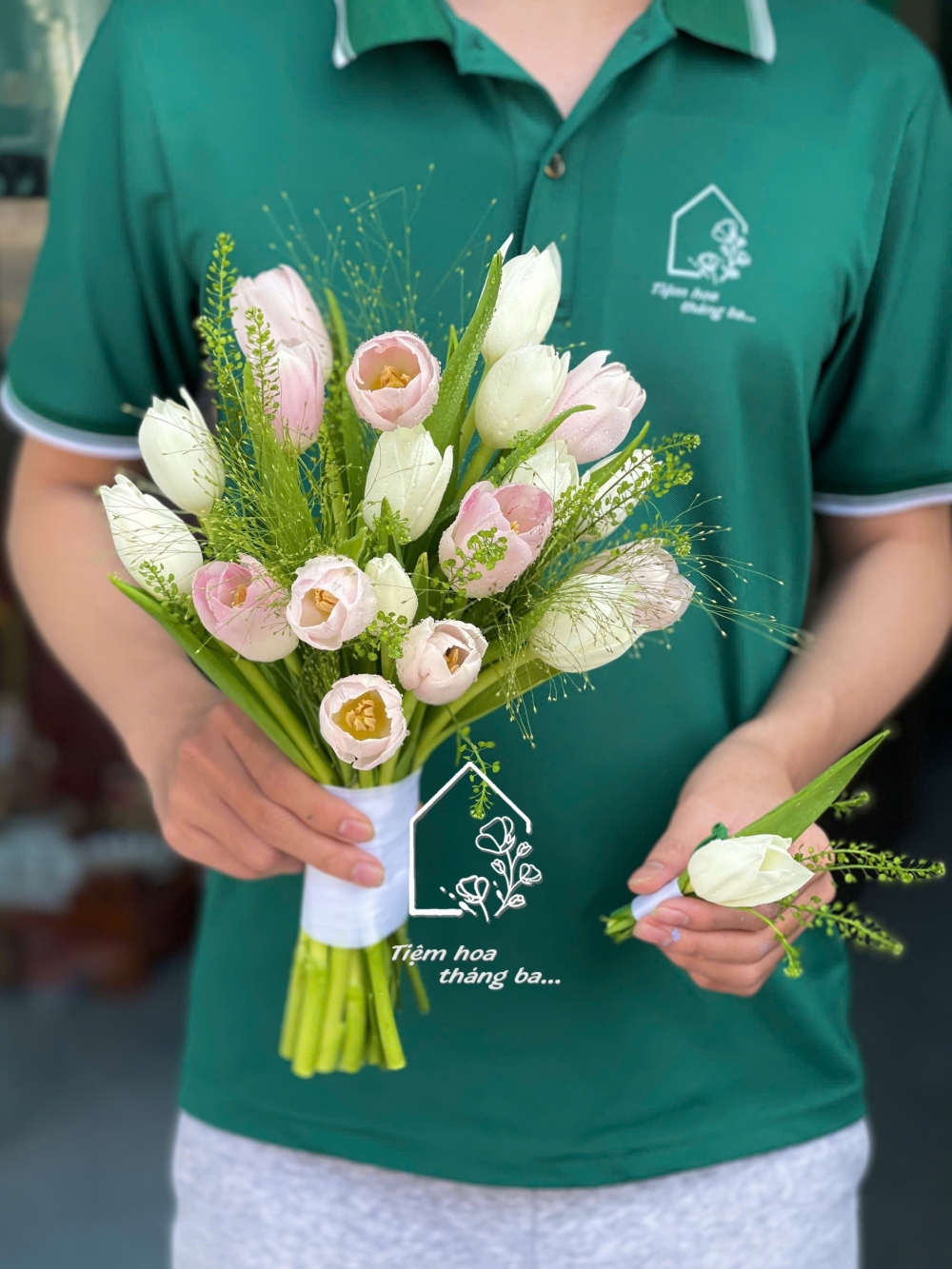 Bó hoa cưới tulip trắng mix tulip hồng và cỏ suối là lựa chọn lý tưởng dành cho những cô dâu yêu thích phong cách tối giản – tự nhiên – thanh lịch. Sự hòa quyện giữa tulip trắng tinh khôi và tulip hồng ngọt ngào tạo nên bảng màu dịu nhẹ, đầy cảm xúc, tượng trưng cho tình yêu trong sáng, chân thành và bền lâu.
