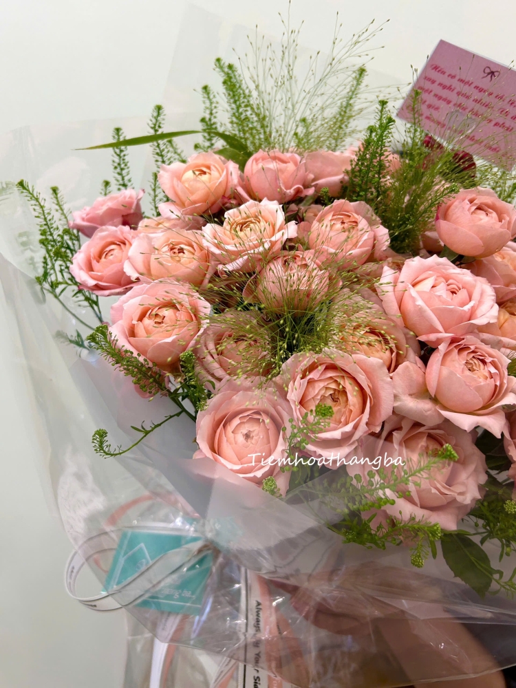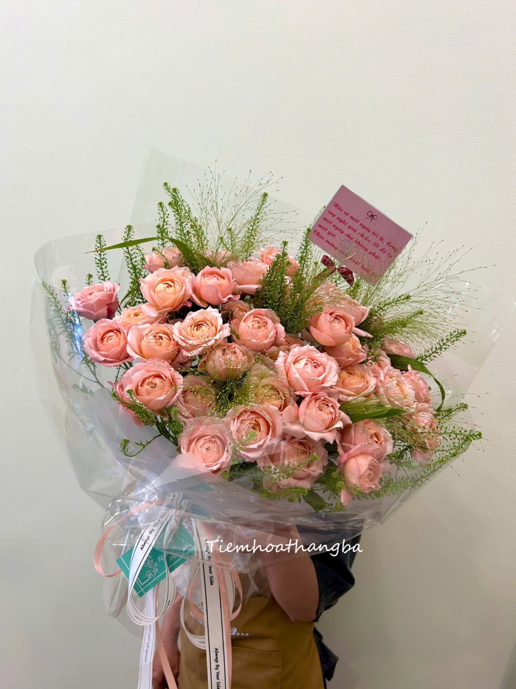 Không cần rực rỡ, không cần phô trương, bó hoa hồng julibee pastel này vẫn khiến trái tim người ngắm phải khẽ rung lên bởi vẻ đẹp tinh khôi và dịu dàng của nó. Từng cánh hồng được chọn lọc kỹ lưỡng – cánh dày, nở tròn, màu cam nhẹ nhàng – hòa quyện với những nhánh cỏ suối và cỏ đồng tiền xanh mảnh mai tạo nên một tổng thể mềm mại, tự nhiên như một khu vườn nhỏ giữa làn gió sớm.