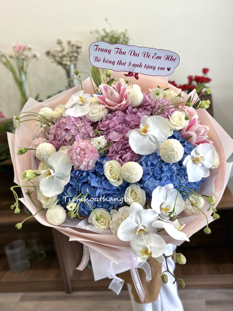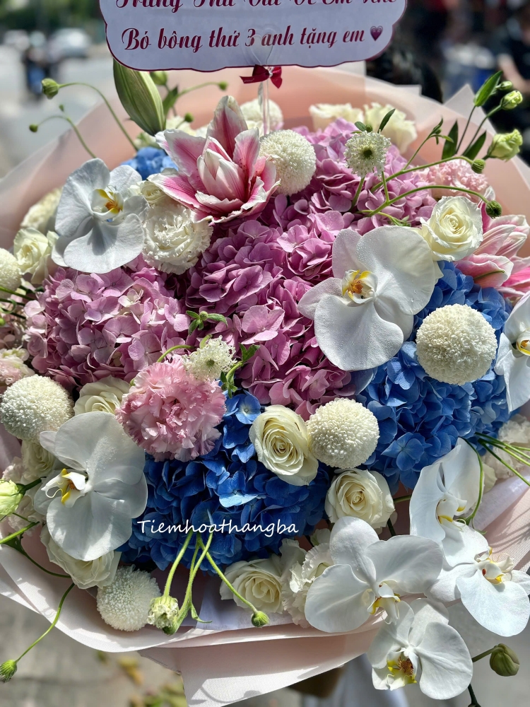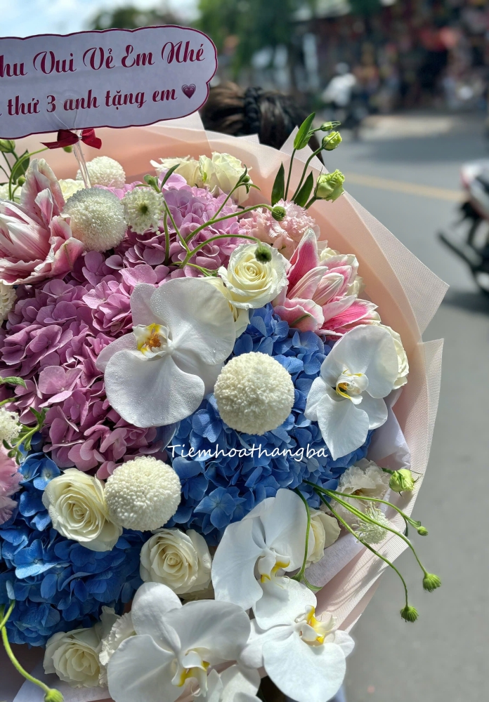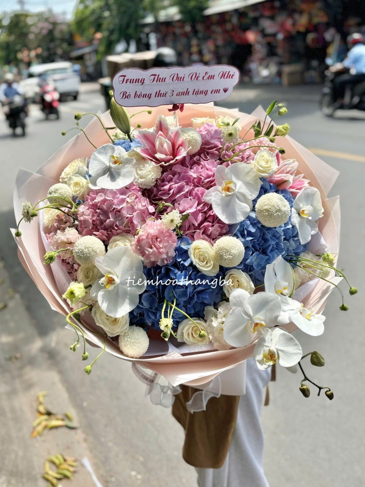Bó hoa khổng lồ của Tiệm Hoa Tháng Ba là minh chứng cho điều đó. Lấy cảm hứng từ khu vườn châu Âu giữa buổi sớm mai, bó hoa kết hợp tú cầu hồng, tú cầu xanh nhập khẩu và lan hồ điệp hòa cùng những nhánh hoa phụ mềm mại như sương.