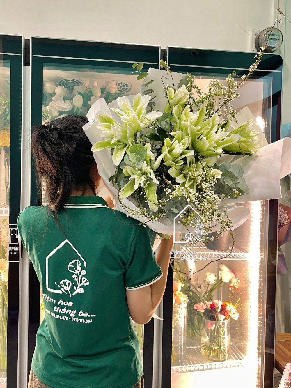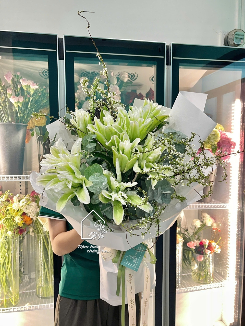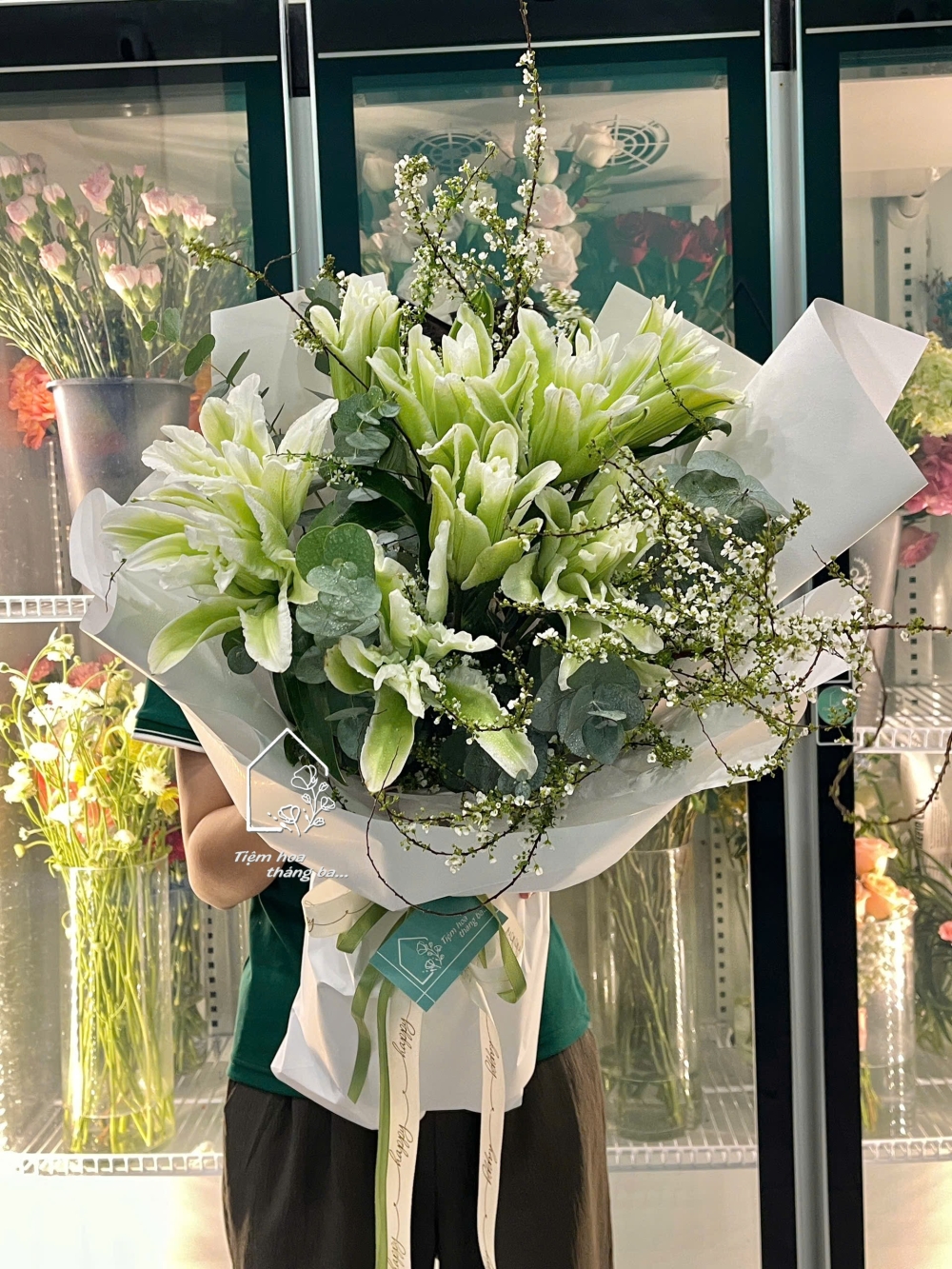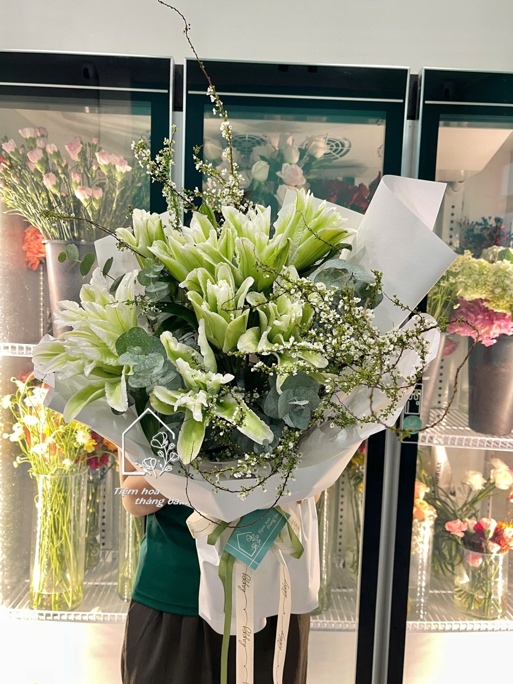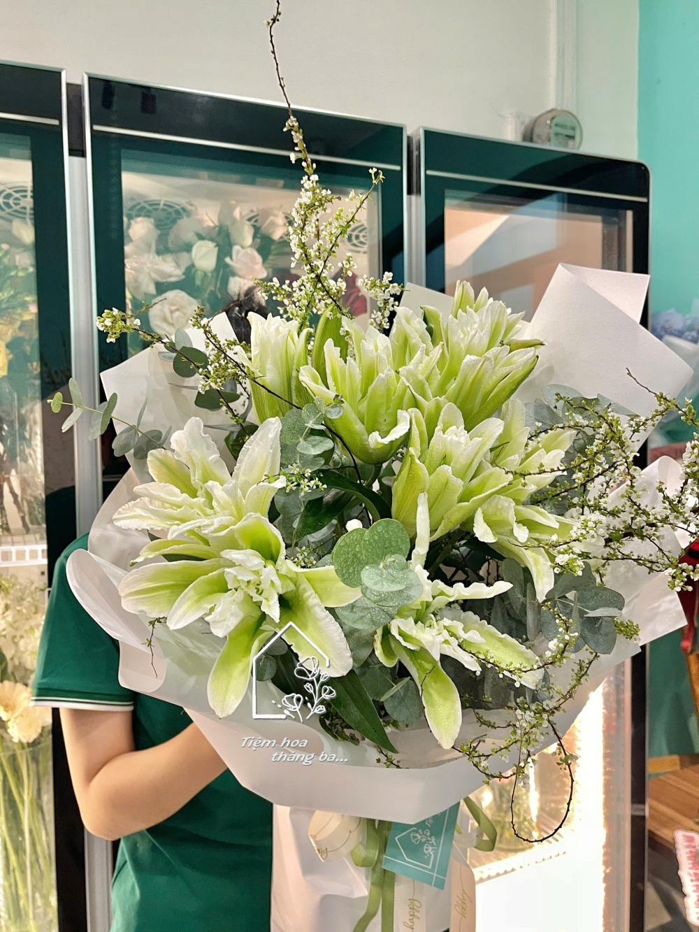 Hoa được phối cùng lá bạc và những nhánh hoa tuyết mai nhỏ xinh, tạo nên tổng thể hài hòa, nhẹ nhàng nhưng vẫn rất nổi bật. Lớp giấy gói trắng tinh tế càng làm tôn lên sắc xanh dịu mát của hoa, mang đến cảm giác thanh lịch và hiện đại.