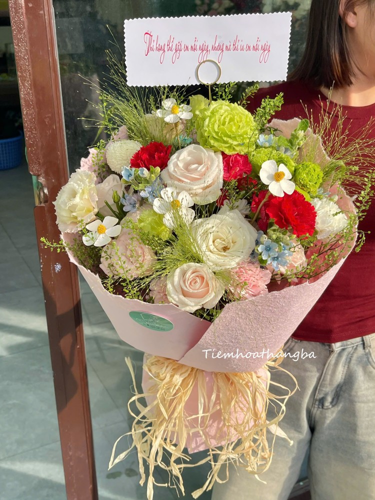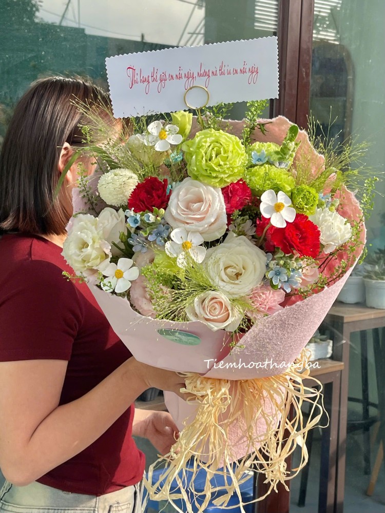 Tiệm có nhận thiết kế hoa tươi theo yêu cầu, bạn có thể cho tiệm biết bạn cần đặt hoa cho dịp gì, tông màu bạn muốn là gì, ngân sách của bạn ra sao, tiệm sẽ thiết kế theo yêu cầu của bạn nhé! Tiệm miễn phí thiết kế banner, thiệp mừng, tiệm giao hoa tận nơi, miễn ship đơn từ 500k bán kính 5km.