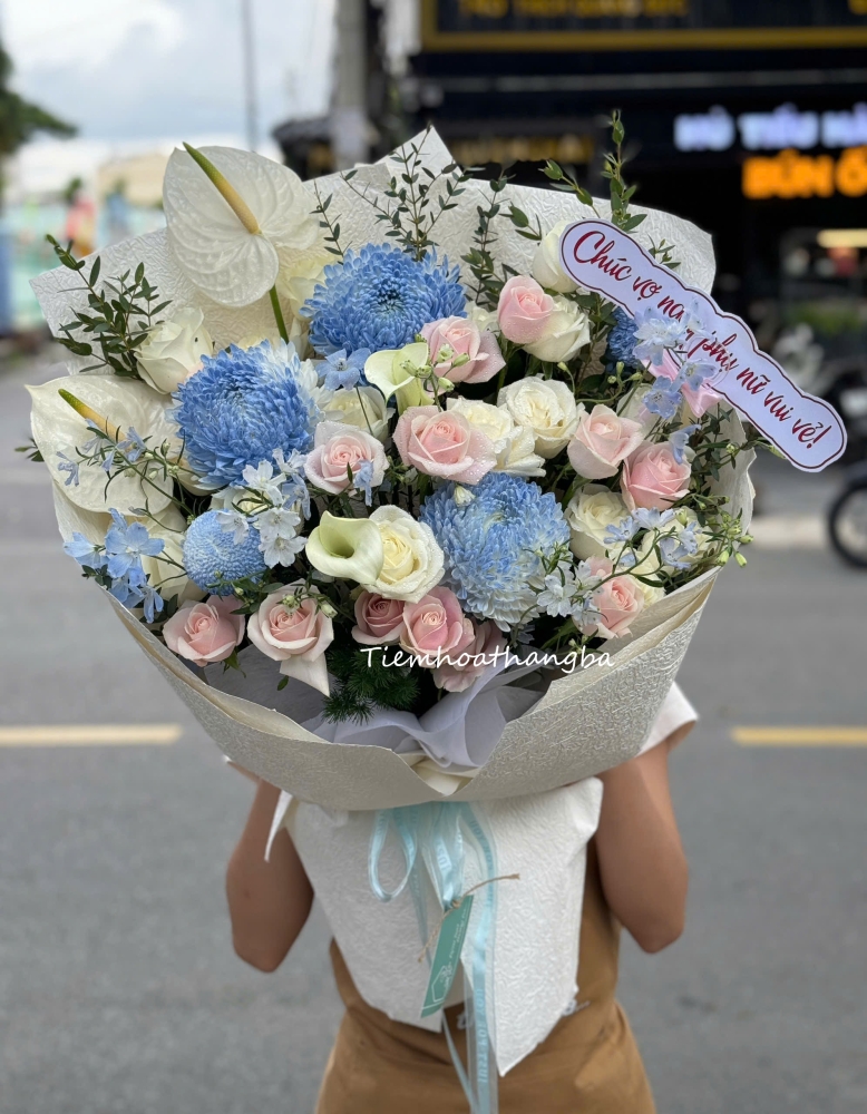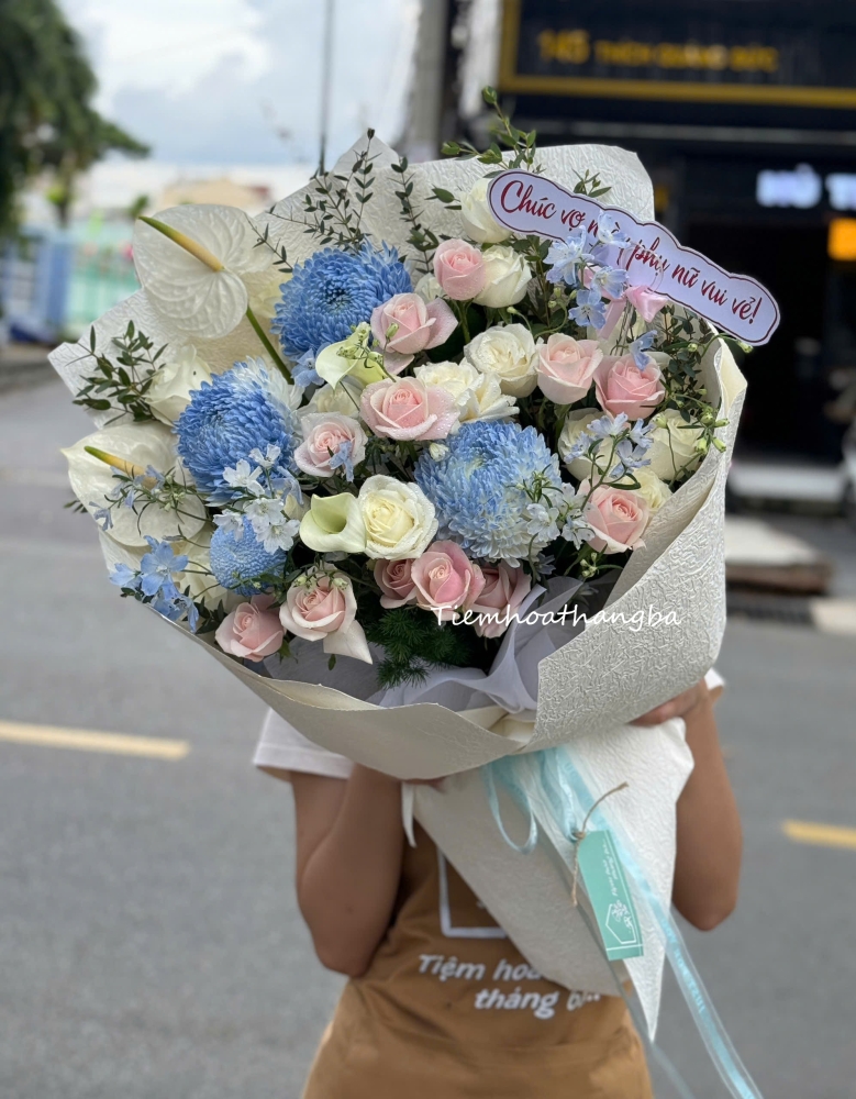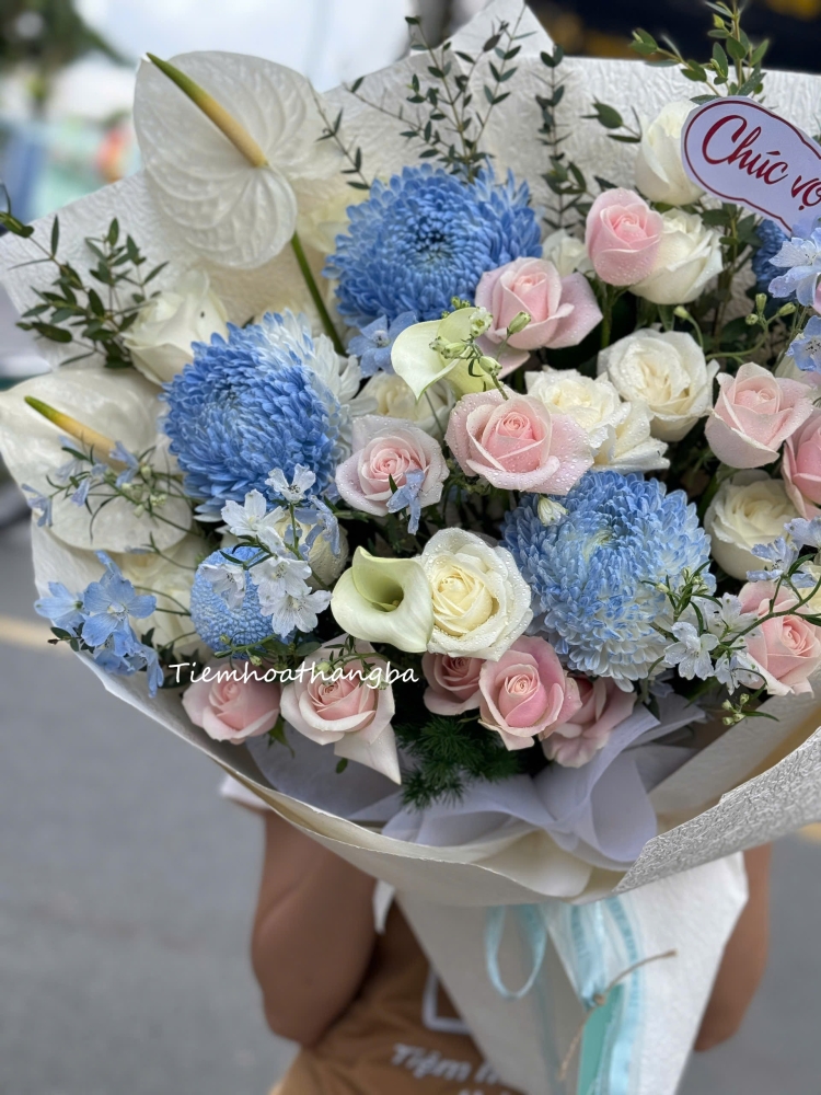 Bó hoa được phối hài hòa giữa sắc xanh pastel dịu nhẹ, trắng thanh khiết, cùng hồng phấn ngọt ngào, như lời thì thầm của tình yêu: nhẹ nhàng nhưng đầy sâu sắc. Mỗi bông cúc mẫu đơn xanh mang theo hơi thở của bình yên, hoa hồng pastel tượng trưng cho tình cảm chân thành, còn rum trắng điểm xuyến nét thanh lịch và cao quý. Tất cả được gói trong lớp giấy nhũ sang trọng, thắt nhẹ bằng ruy băng xanh pastel, tạo nên vẻ đẹp vừa hiện đại vừa lãng mạn.
