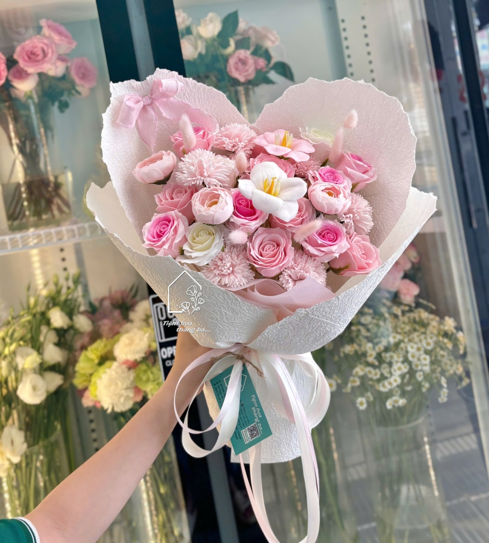 Bó hoa sáp tone hồng là sự kết hợp hoàn hảo giữa vẻ đẹp tinh tế và ý nghĩa ngọt ngào. Những bông hoa sáp được chế tác tỉ mỉ, từng cánh hoa mềm mại và tự nhiên, mang lại cảm giác giống như những đóa hoa tươi vừa mới nở.