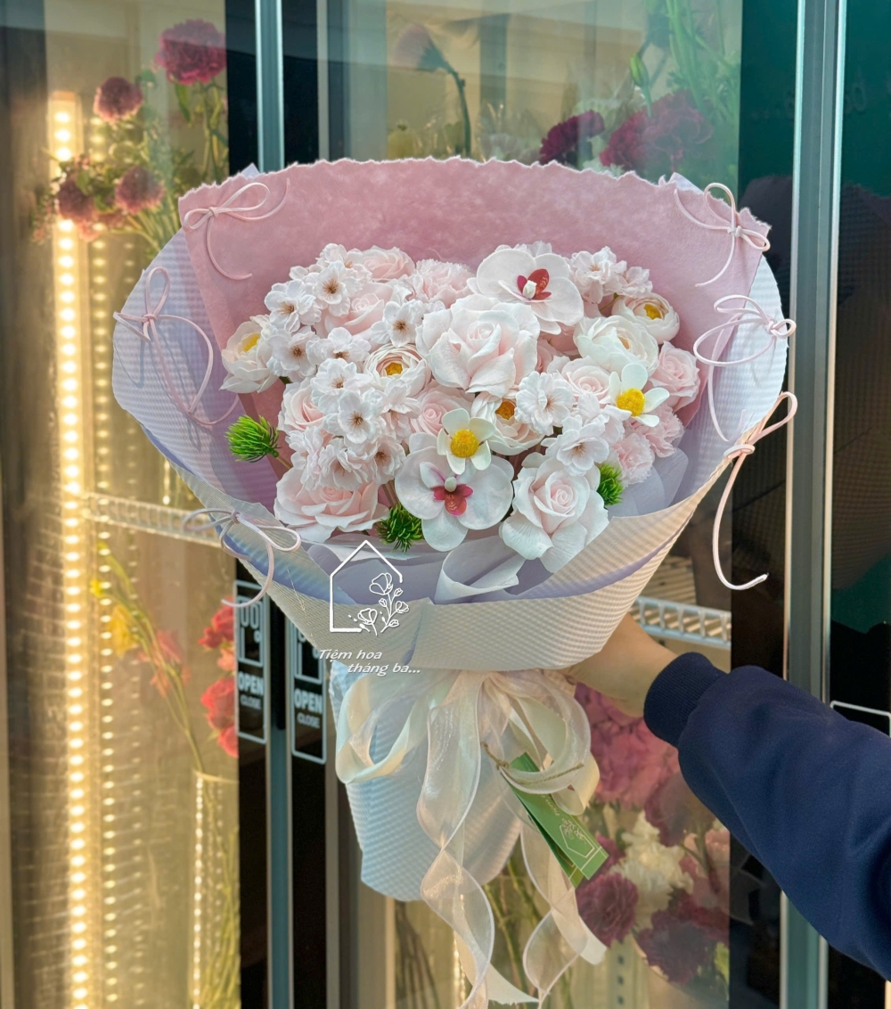 Bó hoa sáp tone hồng pastel mang vẻ đẹp ngọt ngào và tinh tế với những bông hoa sáp hồng, hoa sáp lan hồ điệp, hoa sáp anh đào được thiết kế mềm mại như hoa thật. Gam màu hồng pastel dịu dàng tạo cảm giác lãng mạn, thích hợp làm quà tặng ý nghĩa trong các dịp sinh nhật, kỷ niệm hay ngày lễ đặc biệt.