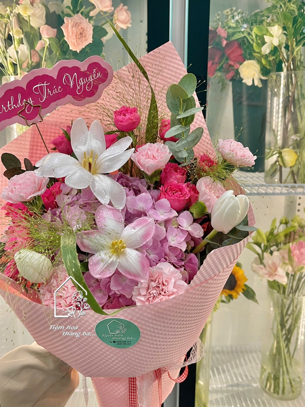 Những bông tulip trắng với dáng hoa thanh mảnh được sắp xếp khéo léo xen kẽ cùng hoa hồng hồng hoặc các loại hoa phụ tone pastel, tạo nên tổng thể hài hòa, mềm mại và rất cuốn hút. Cách gói hoa thường theo phong cách hiện đại, sử dụng giấy gói hồng giúp tôn lên vẻ đẹp tinh tế của từng bông hoa.