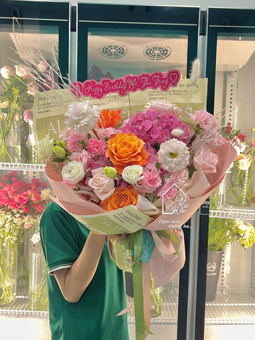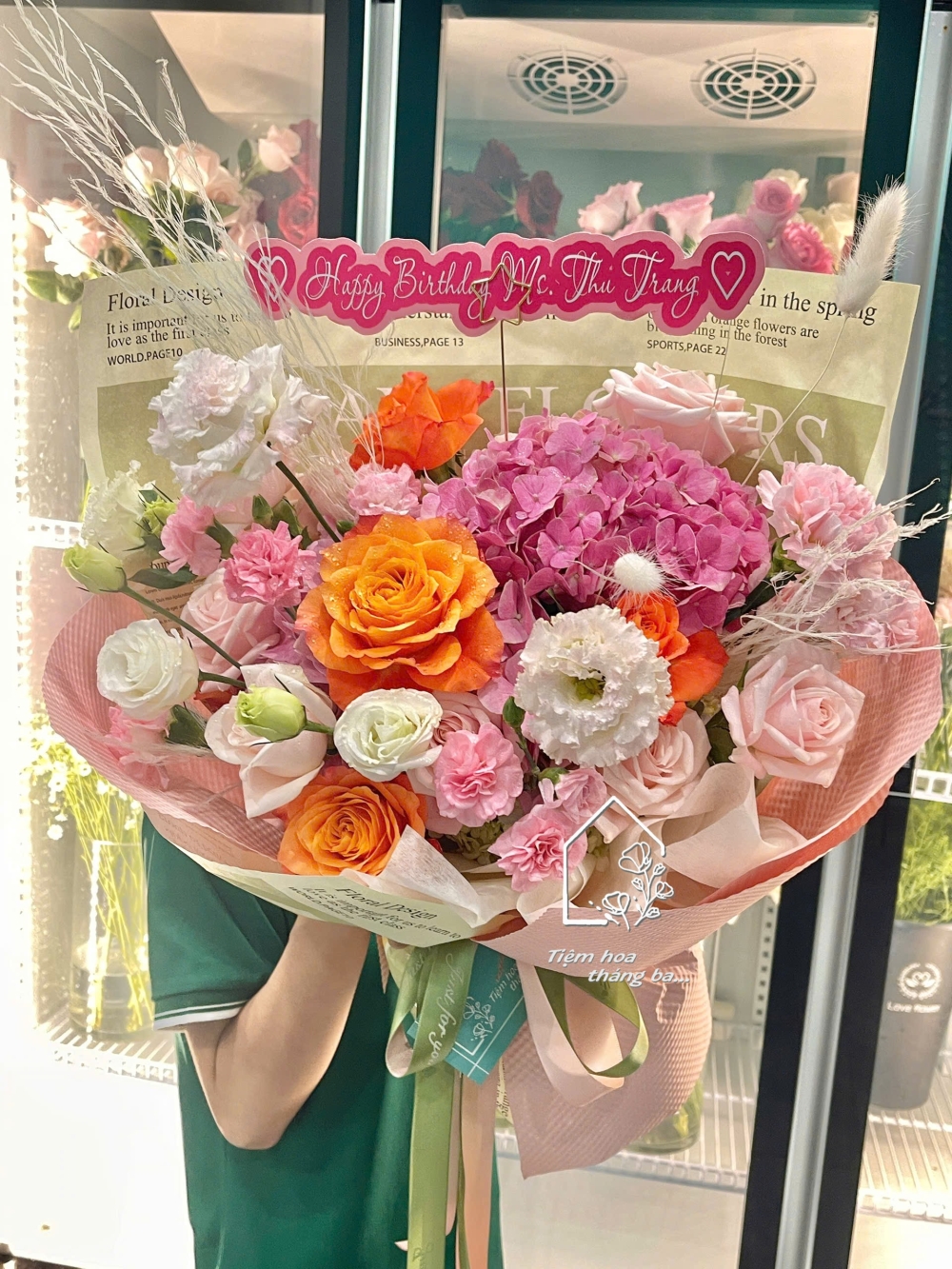 Bó hoa phối màu hồng pastel – cam tươi tắn, kết hợp tú cầu hồng nhập khẩu, hồng kem dâu, cẩm chướng và hoa hồng cam spirit nổi bật. Thiết kế mềm mại, rạng rỡ, phù hợp tặng sinh nhật, chúc mừng và những dịp đặc biệt đầy niềm vui.