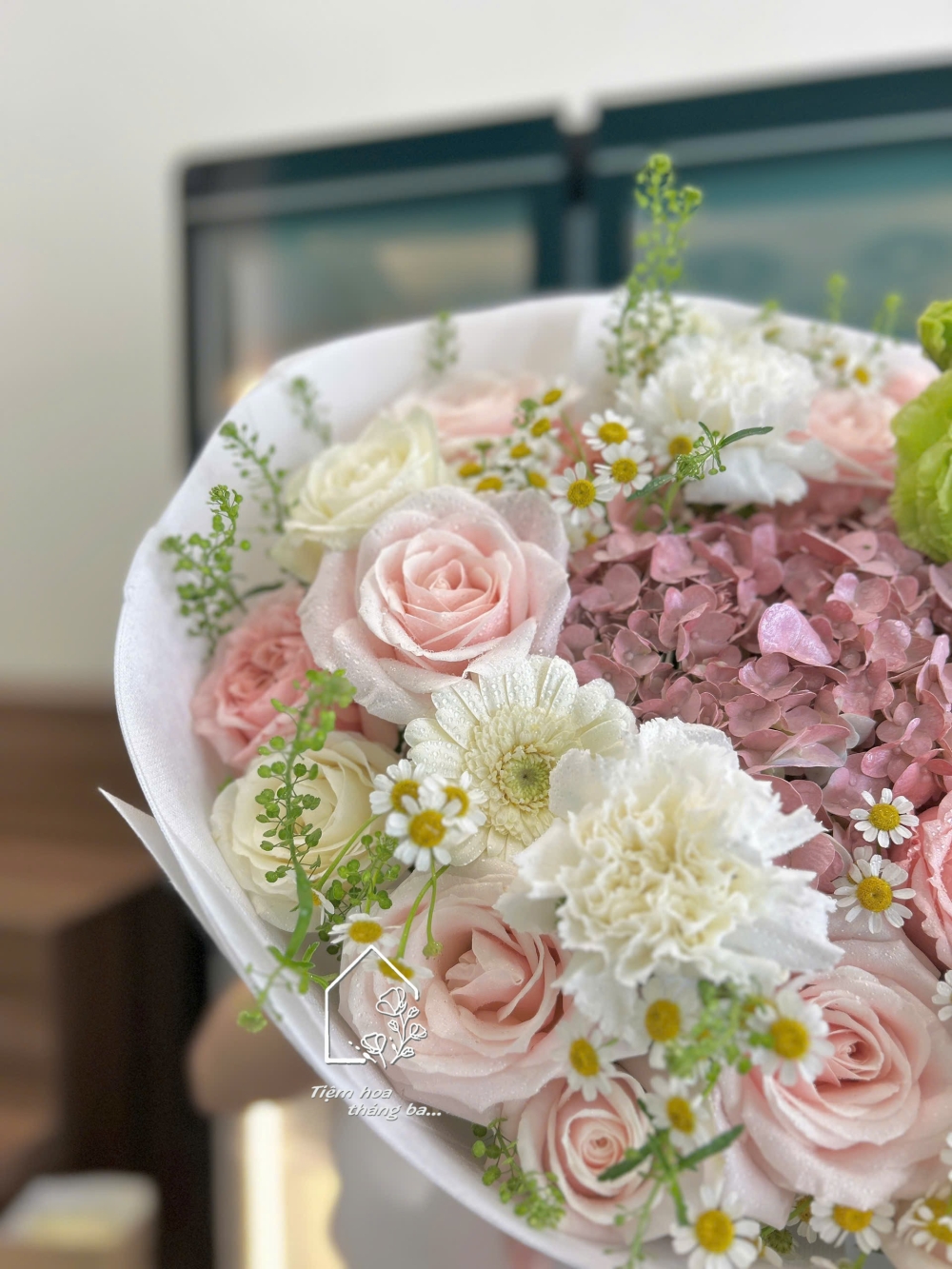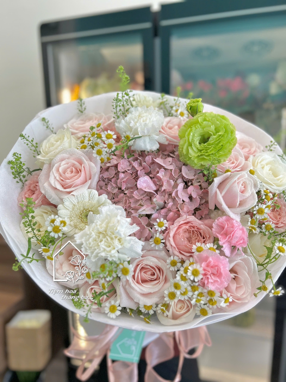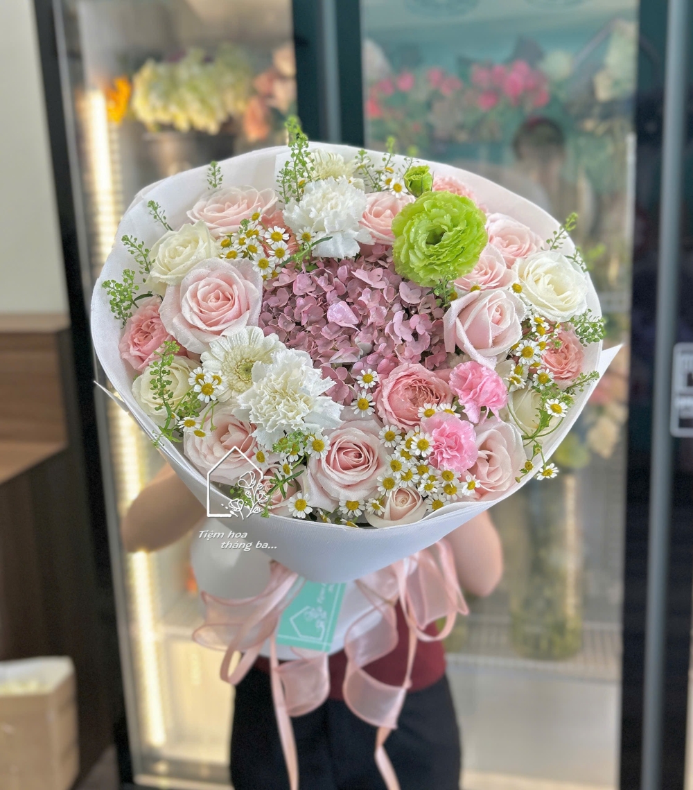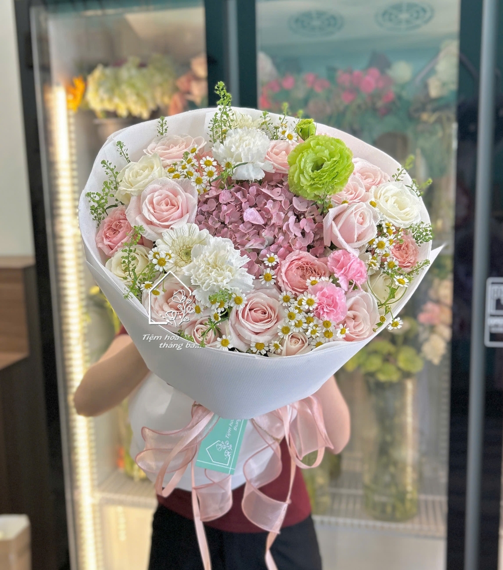 Bó hoa được thiết kế với gam hồng pastel ngọt ngào, phối hài hòa giữa hoa hồng kem dâu mềm mại, cẩm tú cầu hồng lãng mạn, cẩm chướng trắng tinh khôi cùng hoa cúc tana và lá xanh tươi mát. Tổng thể bó hoa mang vẻ đẹp dịu dàng, trong trẻo nhưng vẫn rất sang trọng và hiện đại.