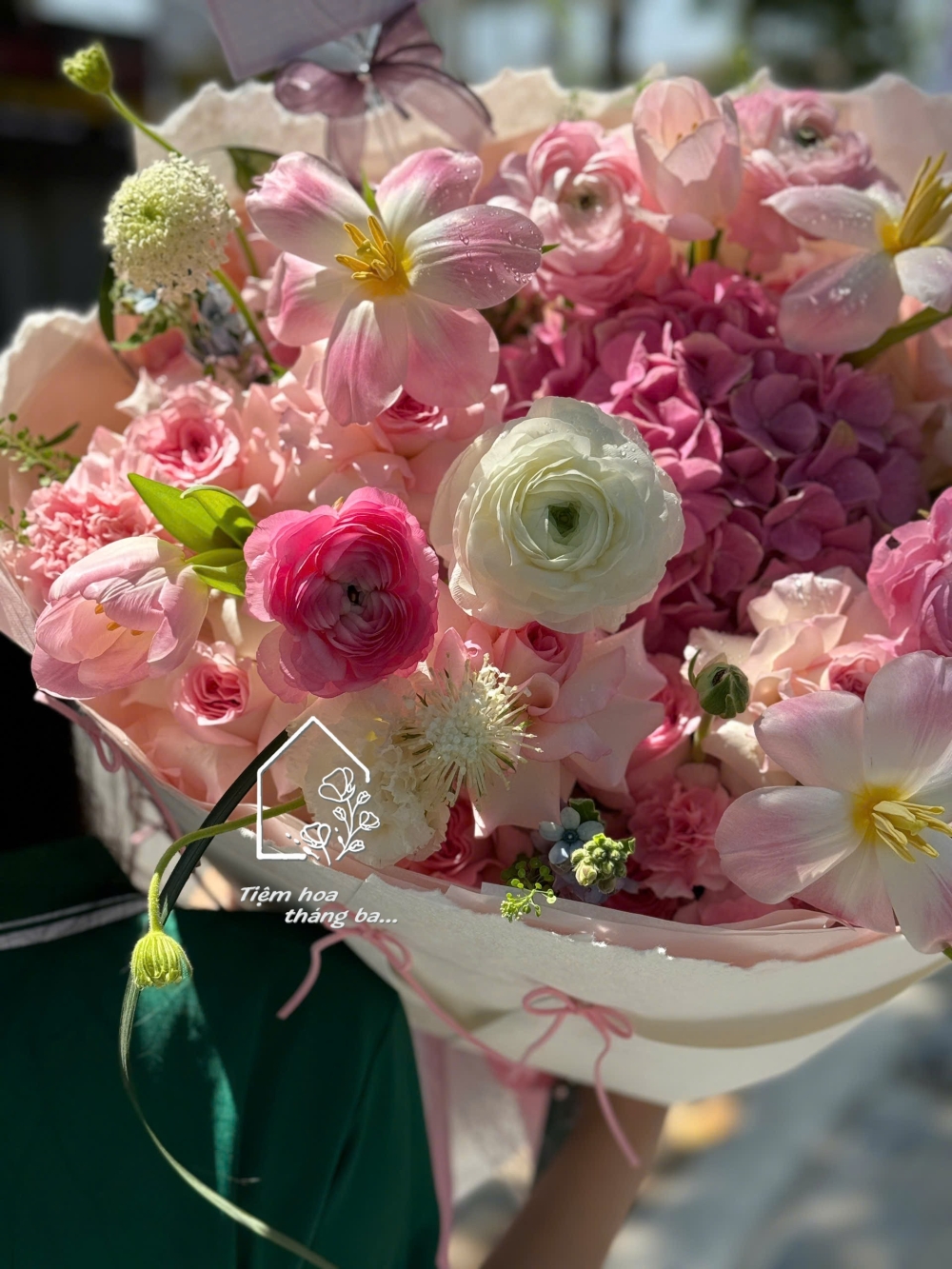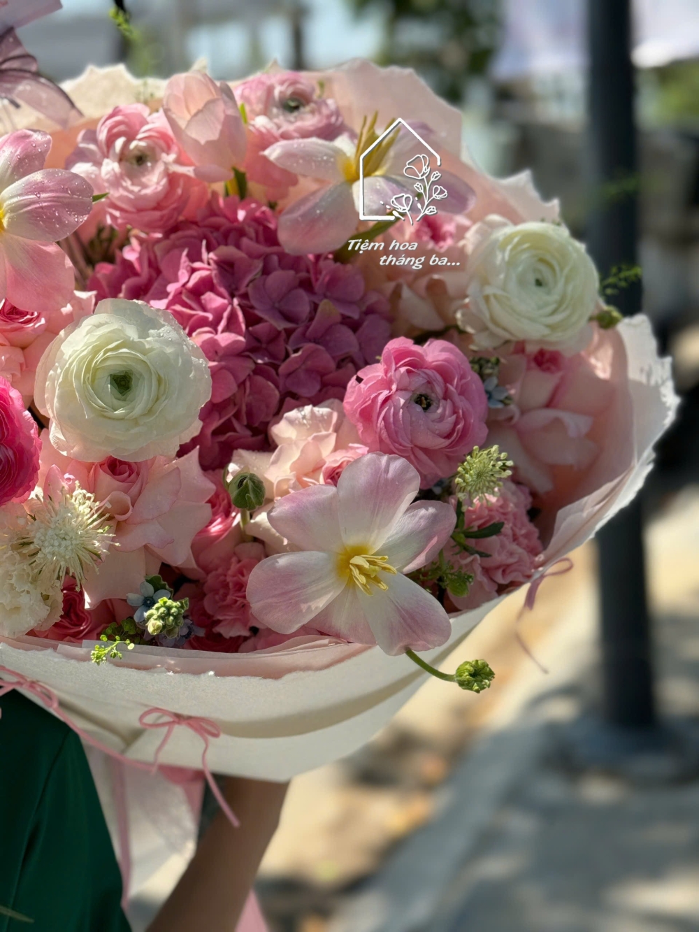 Bó hoa là sự kết hợp hài hòa giữa tú cầu tròn đầy và tulip thanh mảnh, tạo nên tổng thể vừa mềm mại vừa tinh tế. Những cụm tú cầu bồng bềnh như những đám mây nhỏ, ôm trọn những cành tulip đang vươn mình đầy sức sống.