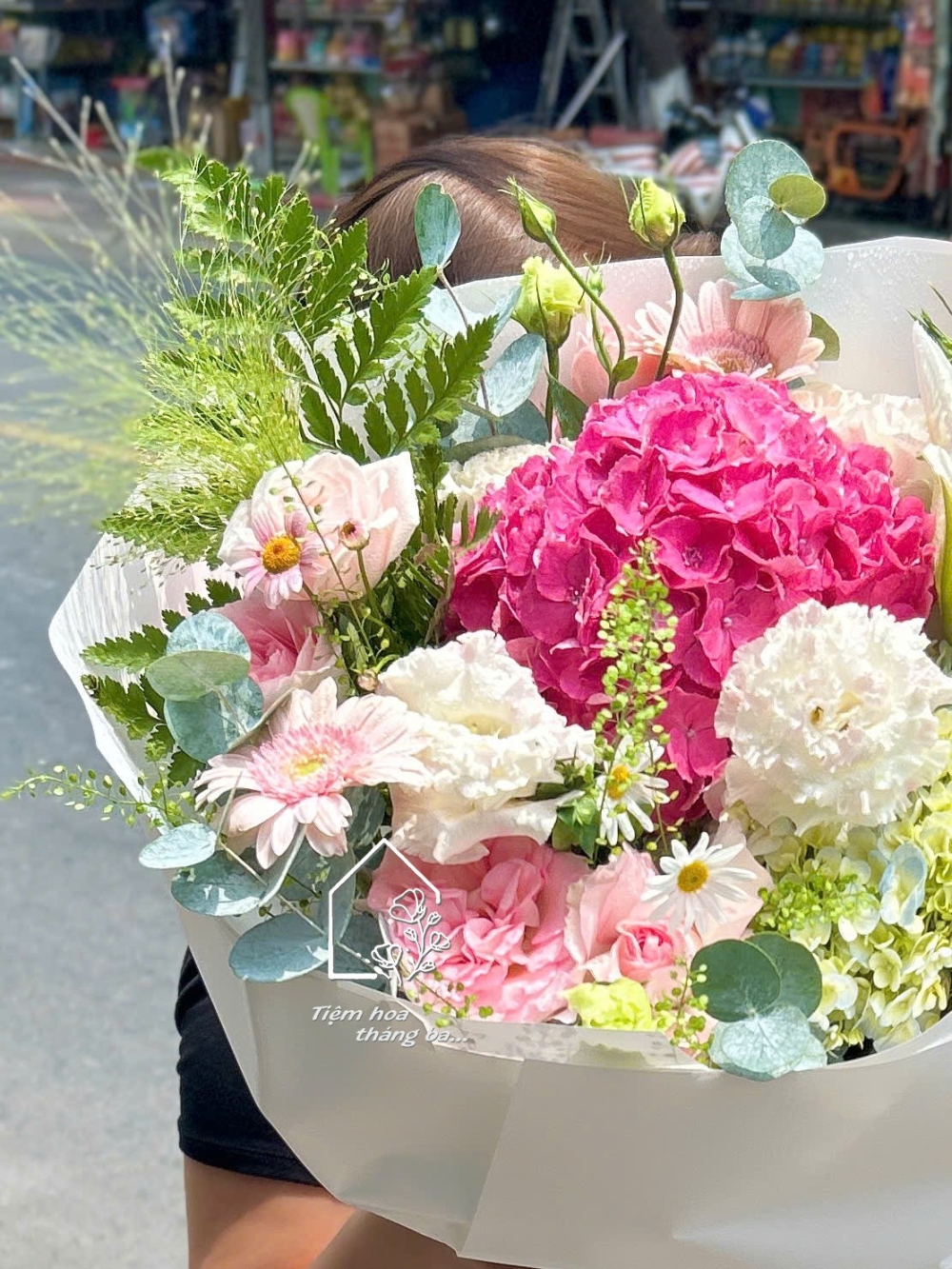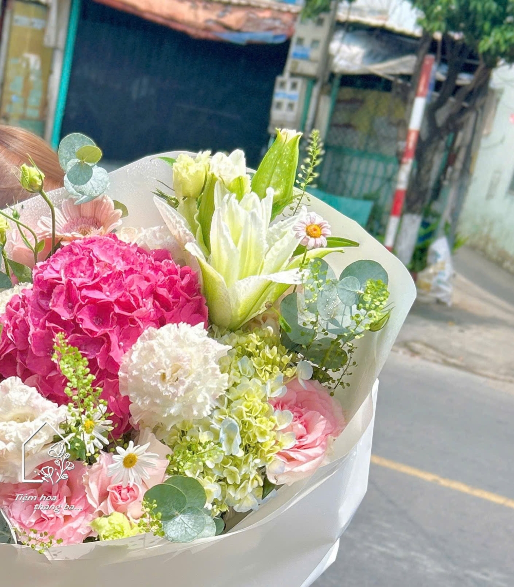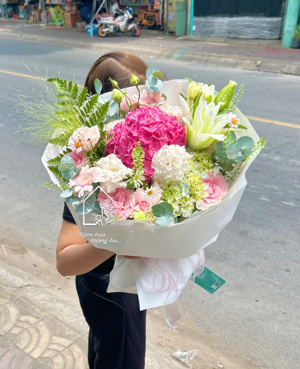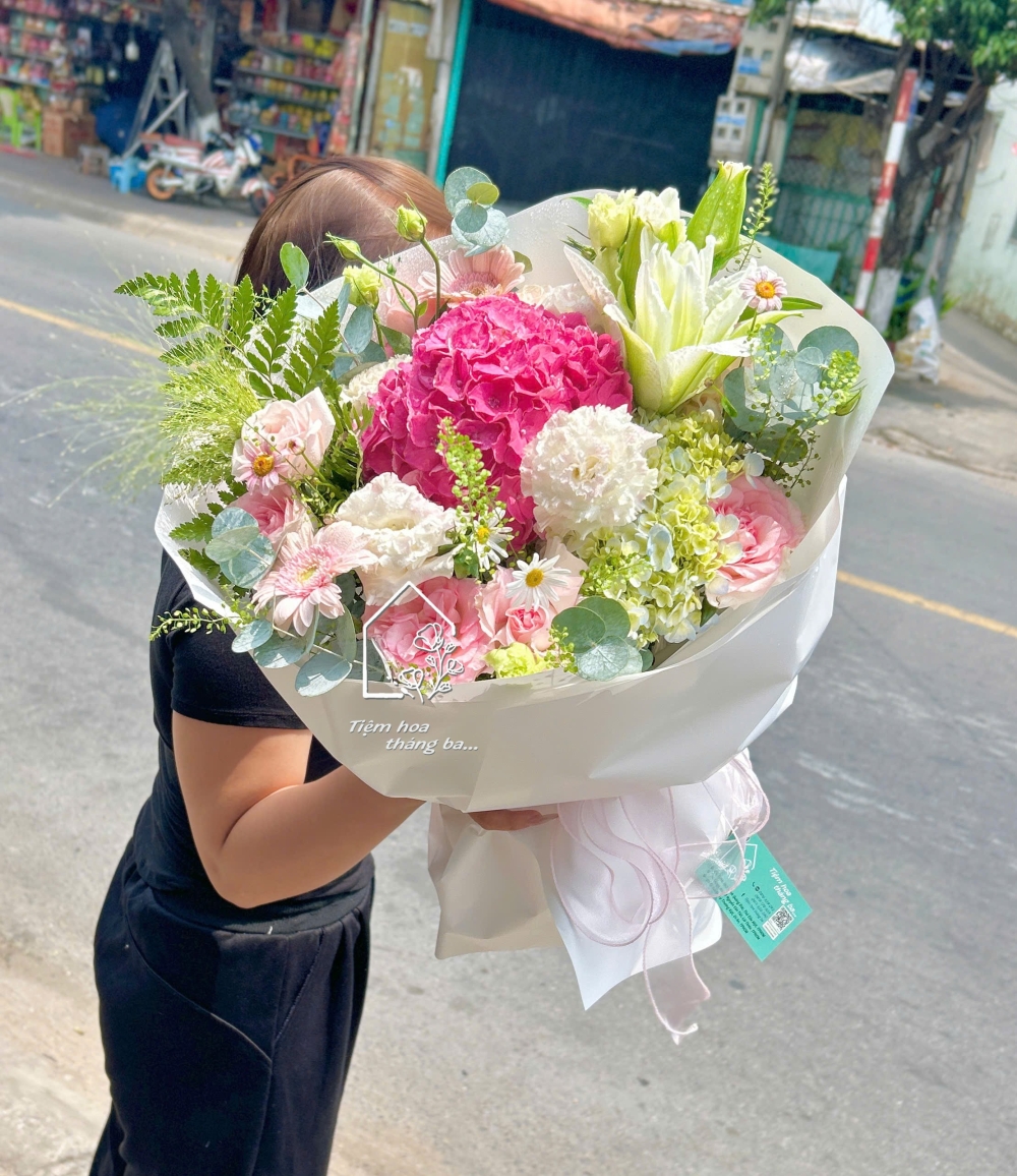 Bó hoa này là sự hòa quyện tinh tế giữa sắc hồng rực rỡ của tú cầu và sắc trắng thanh khiết của hoa ly, tạo nên tổng thể vừa nổi bật vừa nhẹ nhàng – đúng kiểu ngọt nhưng không gắt, xinh mà không quá cầu kỳ.