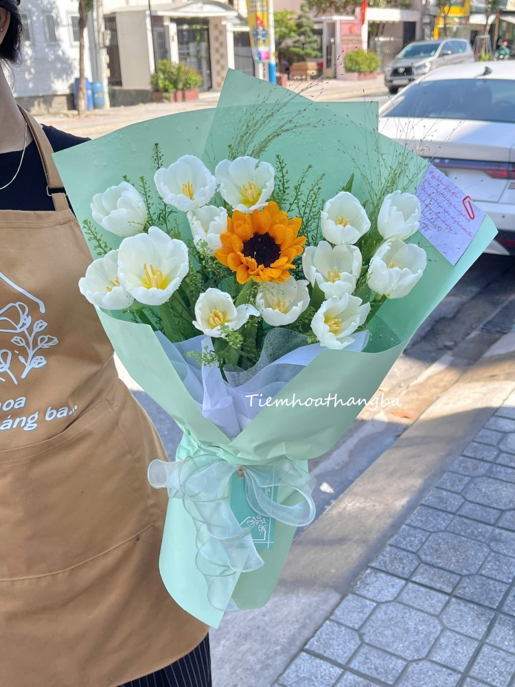 Một bó hoa nhẹ nhàng mà tràn đầy năng lượng tích cực – đó chính là tulip trắng mix hướng dương. Bó hoa nổi bật với bông hướng dương vàng rực, tượng trưng cho sự mạnh mẽ, nghị lực và niềm tin vào những điều tốt đẹp, hòa quyện cùng những bông tulip trắng thanh khiết – đại diện cho sự chân thành, giản dị và tinh tế.