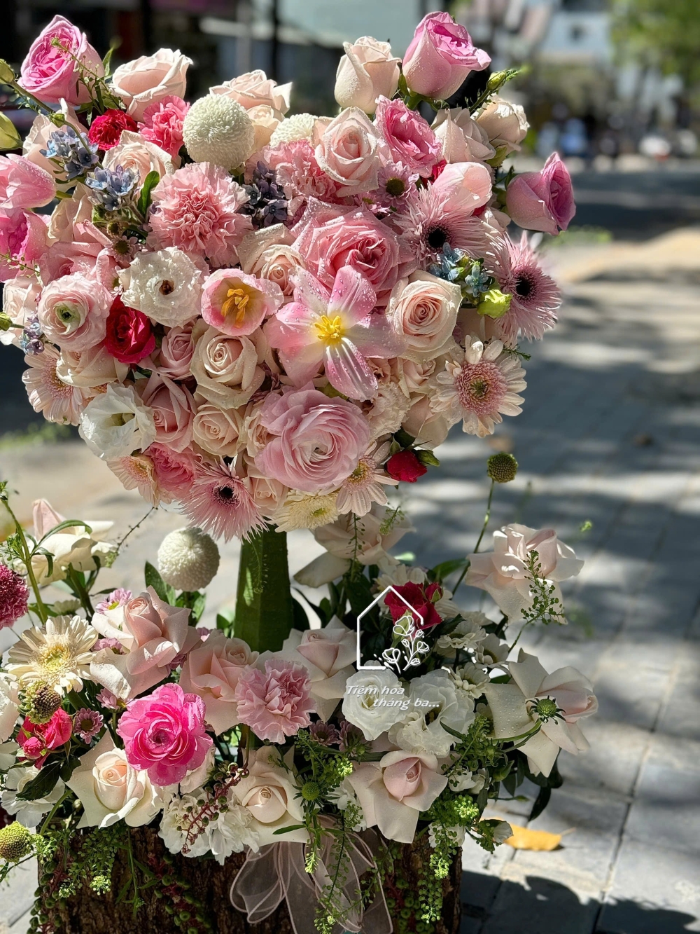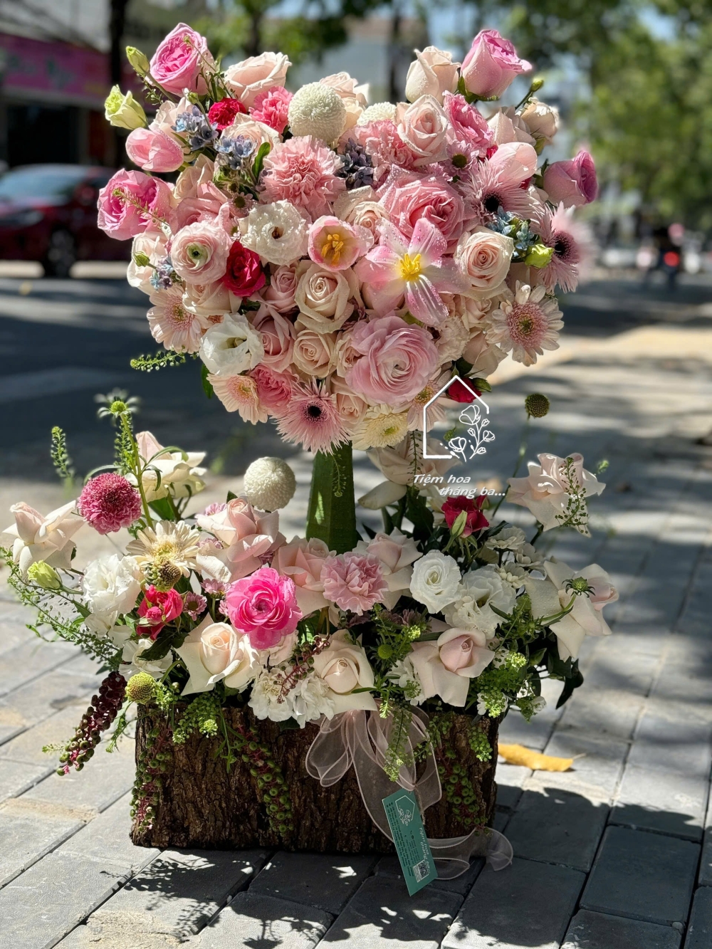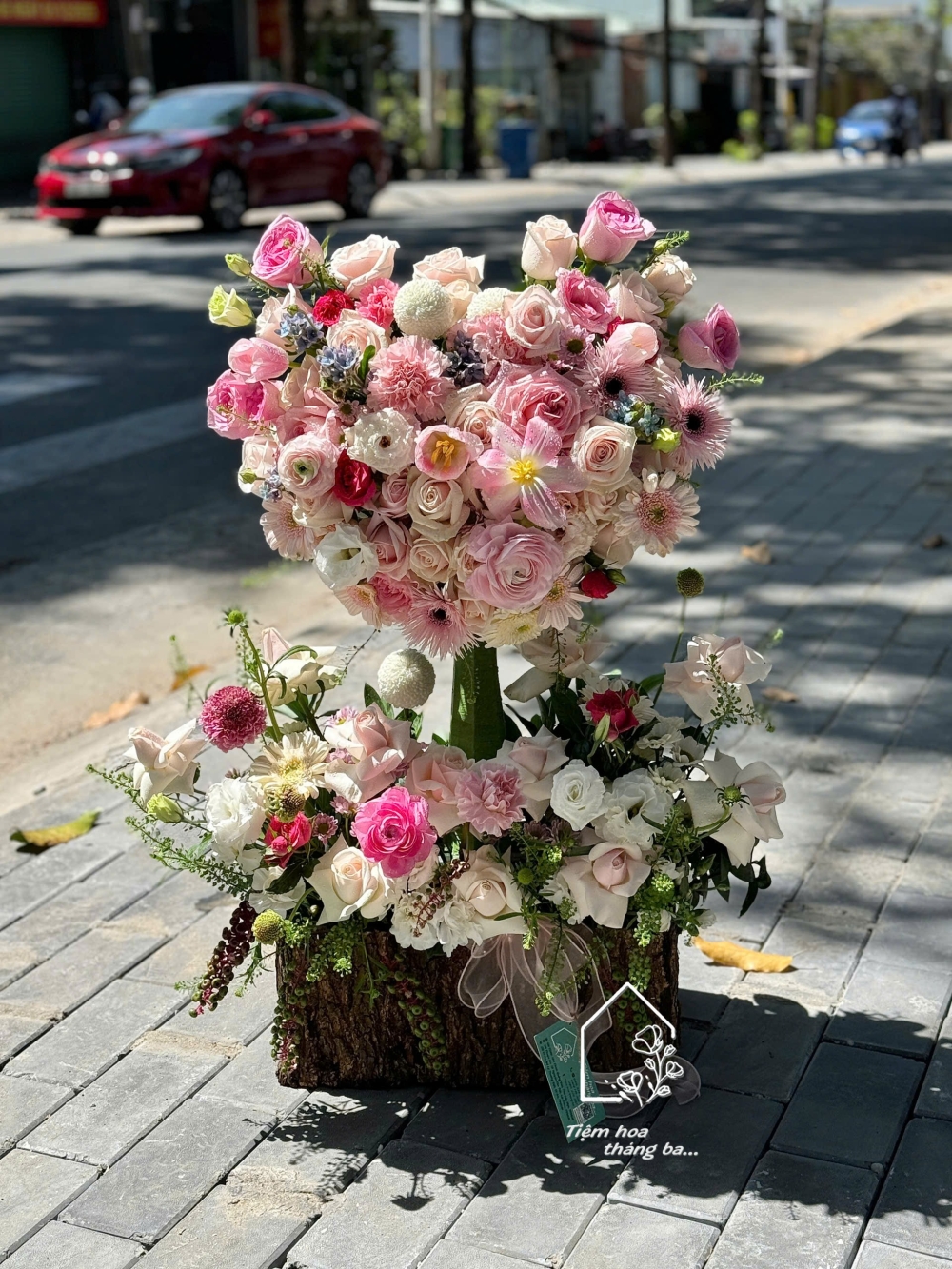 Những cánh hoa được sắp xếp tỉ mỉ tạo nên hình trái tim mềm mại, tượng trưng cho tình yêu chân thành, sự quan tâm và những cảm xúc ngọt ngào dành cho người nhận. Phần hộp gỗ phía dưới được trang trí thêm nhiều hoa tươi và lá xanh, giúp tổng thể thiết kế trở nên hài hòa, tự nhiên và sang trọng hơn.