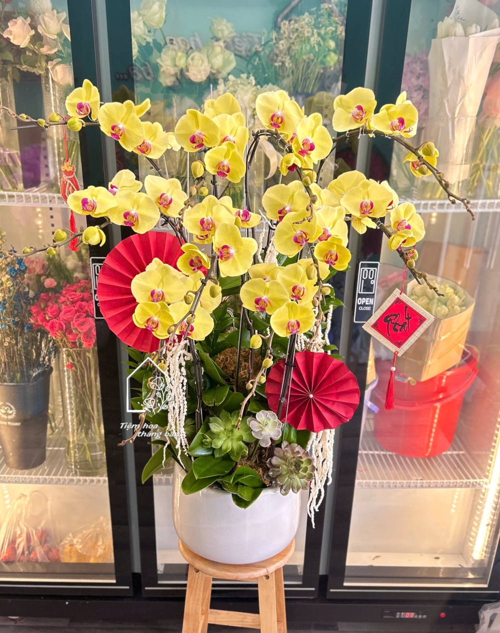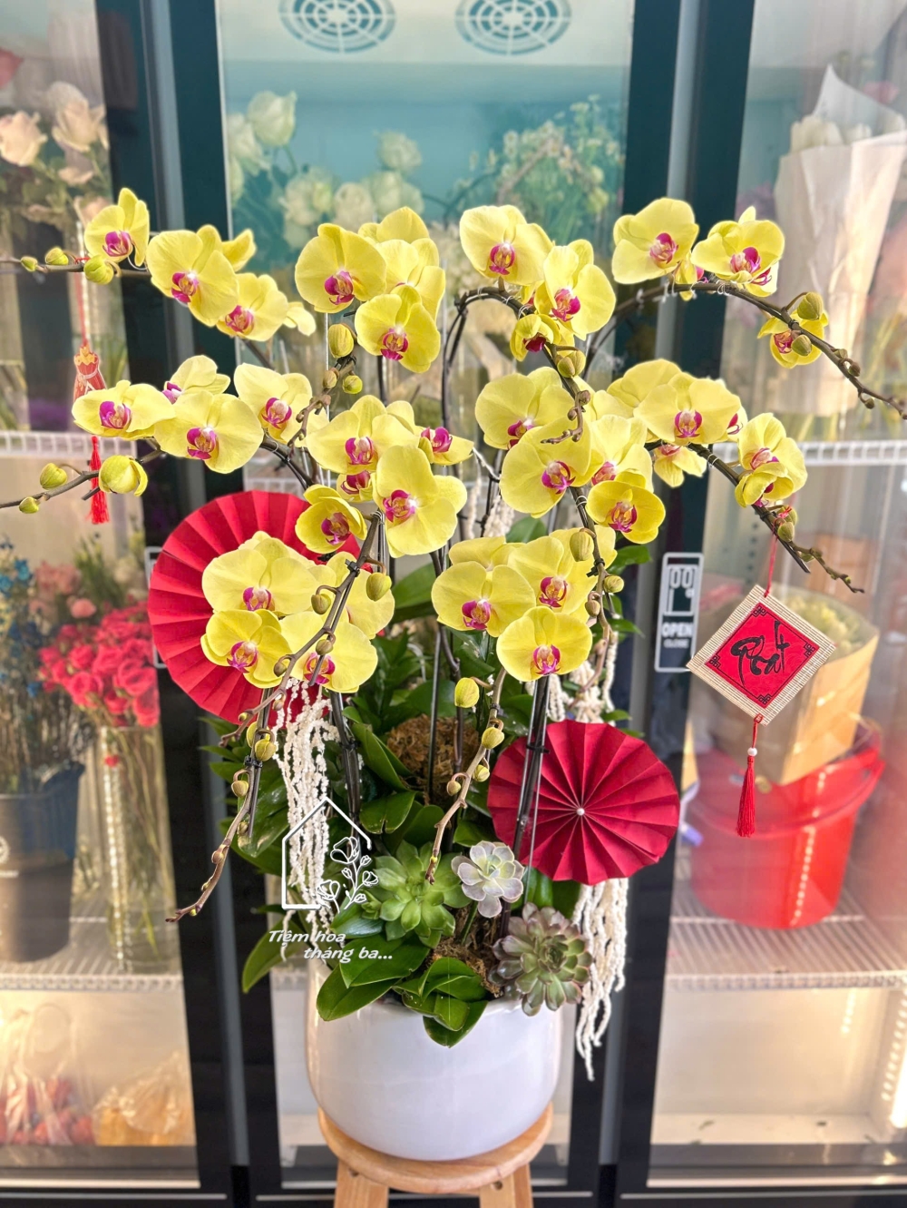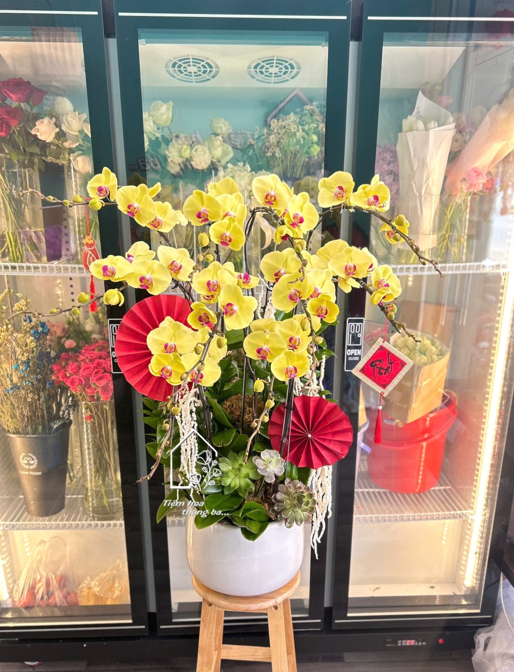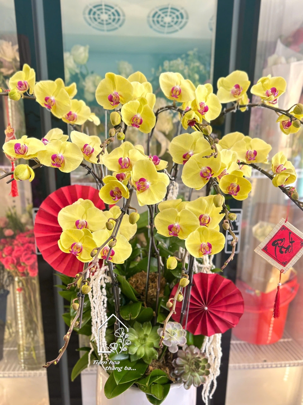 Những cành lan mềm mại vươn cao, từng bông hoa nở tròn đầy và thanh thoát tạo nên tổng thể hài hòa, tinh tế. Khi được trồng trong chậu và trang trí khéo léo, chậu lan hồ điệp vàng không chỉ là một tác phẩm nghệ thuật mà còn là điểm nhấn nổi bật cho không gian.