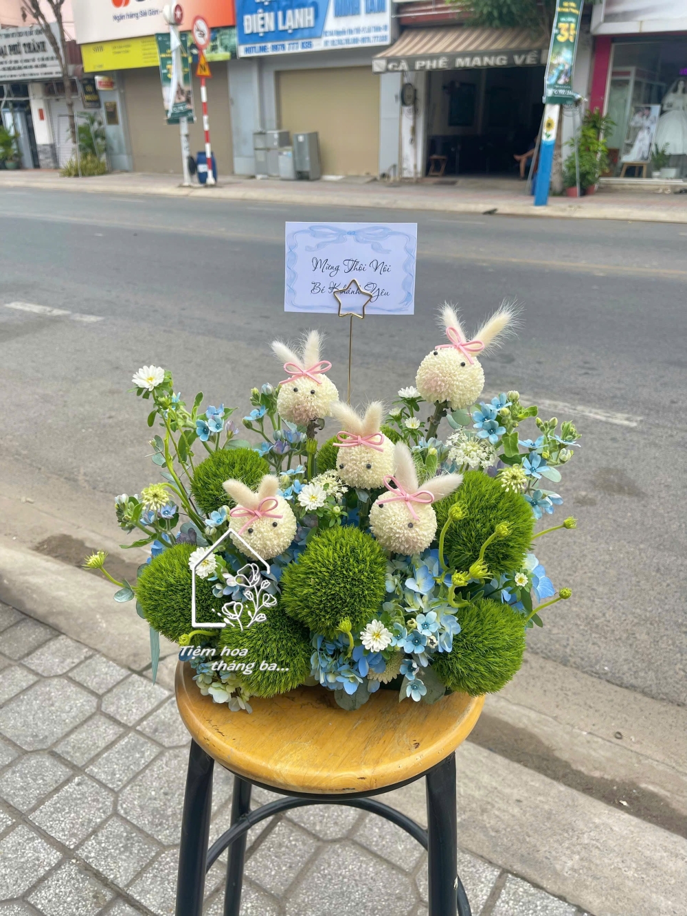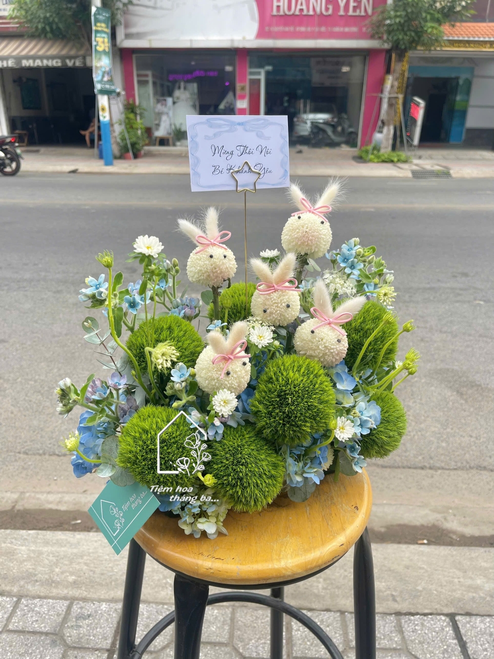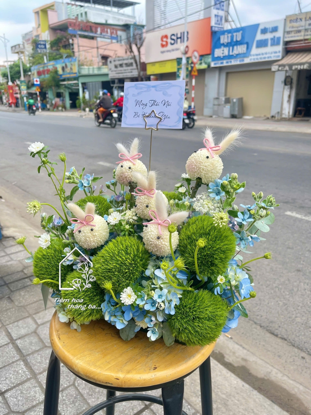 Giỏ hoa trong hình mang một phong cách cực kỳ đáng yêu và tươi mới, nổi bật với những “bé thỏ” nhỏ xinh được tạo hình từ hoa, điểm thêm tai mềm và nơ hồng nhẹ nhàng. Đây chính là điểm nhấn khiến tổng thể trở nên sinh động, ngộ nghĩnh và đầy cảm xúc.