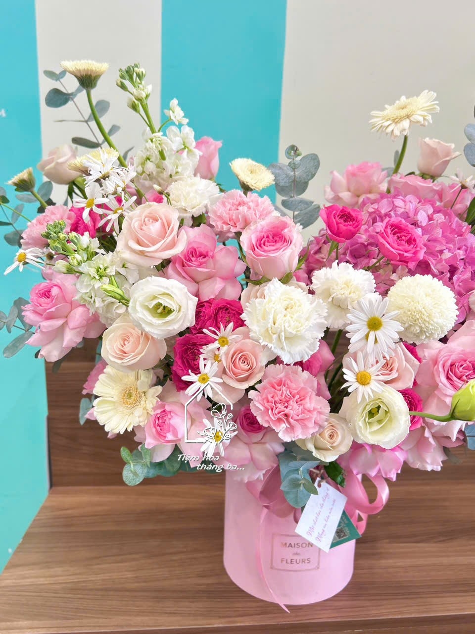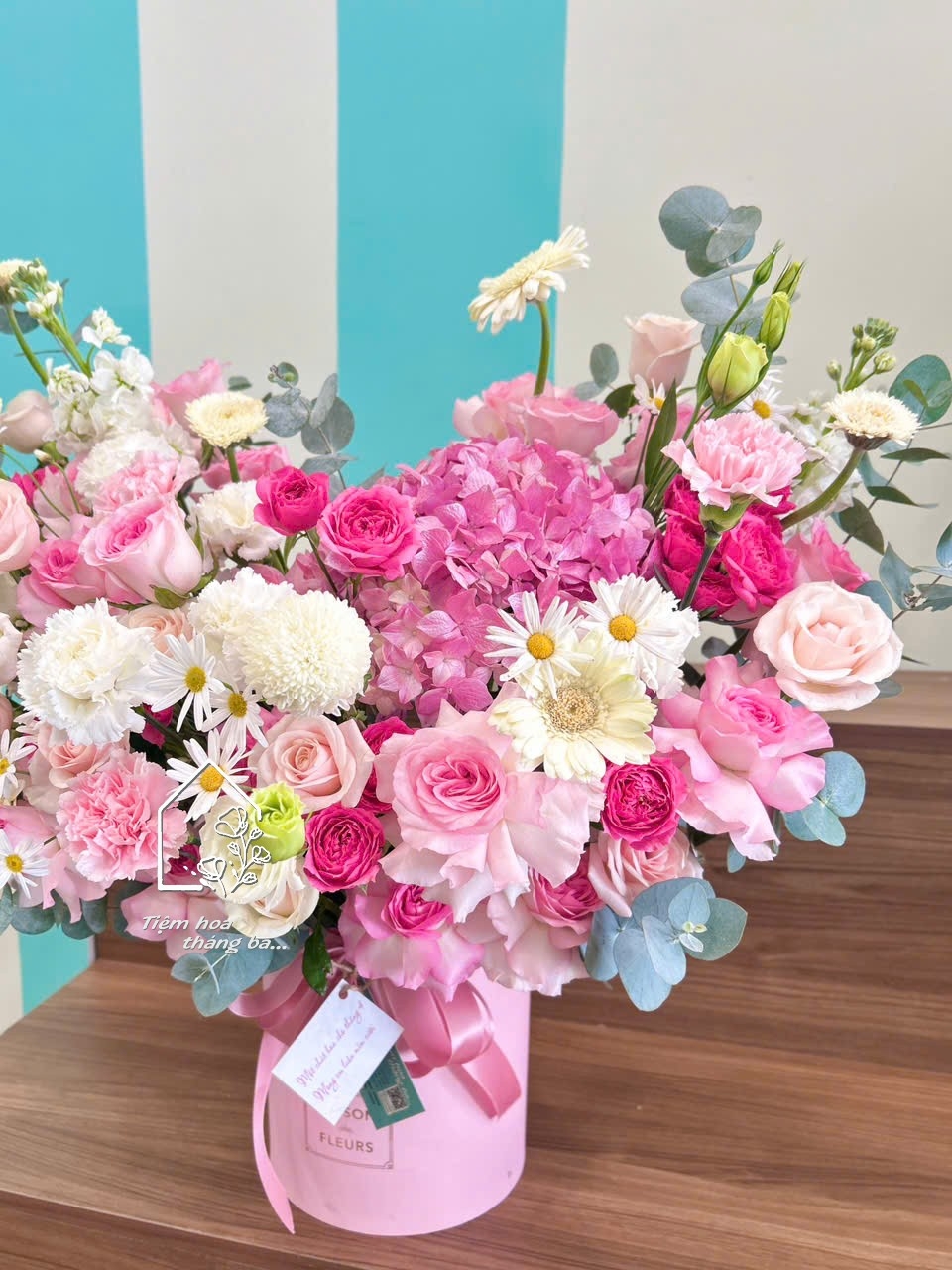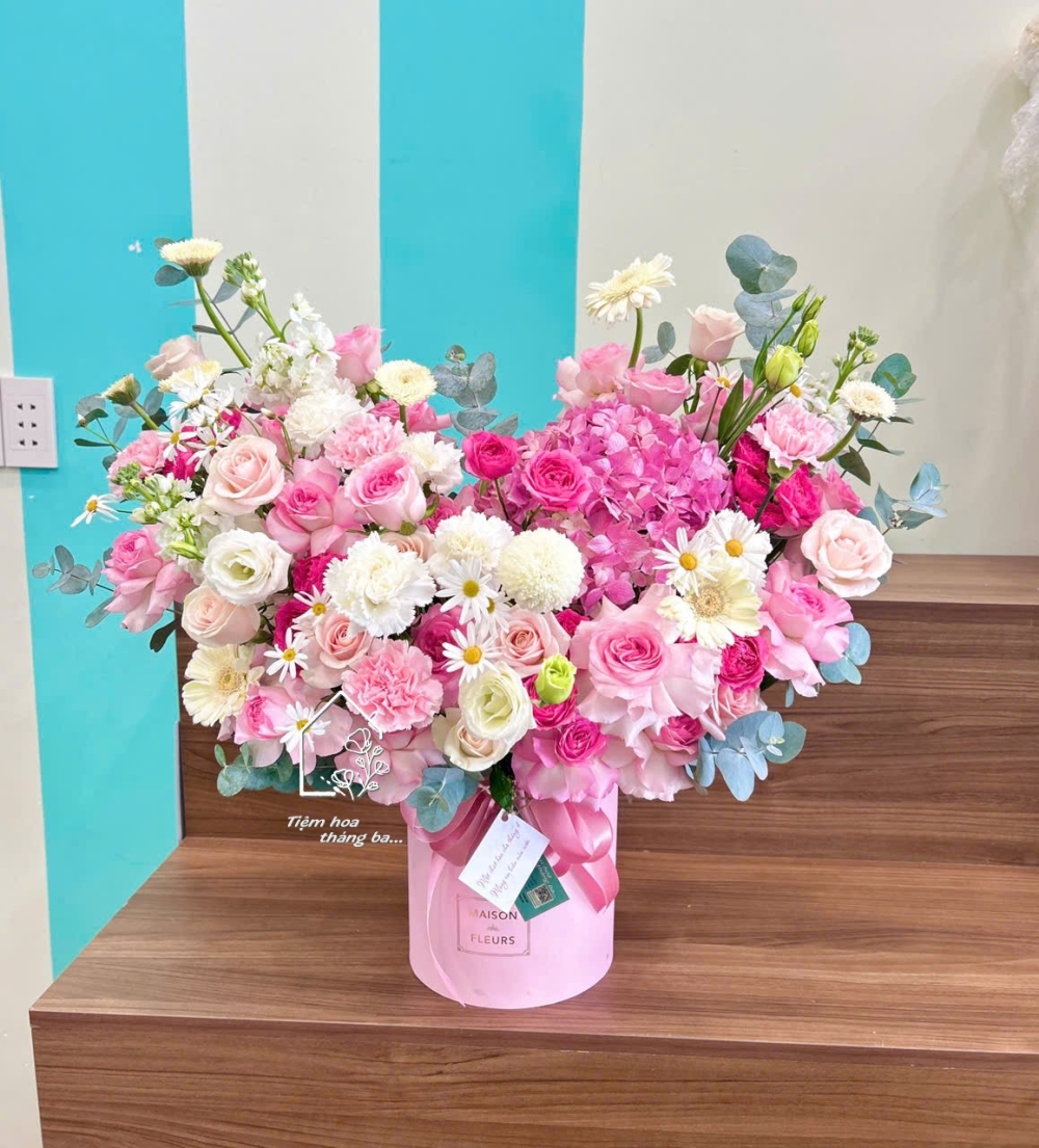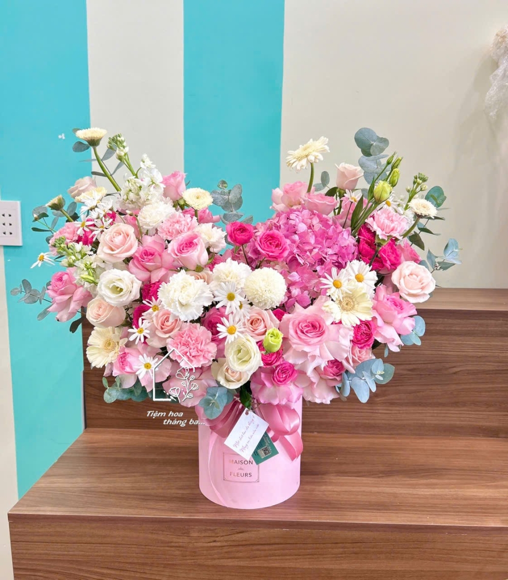 Giỏ hoa tone hồng pastel kết hợp cẩm tú cầu, hoa hồng và hoa phụ trắng – thiết kế mềm mại, tinh tế, mang vẻ đẹp dịu dàng và đầy cuốn hút.