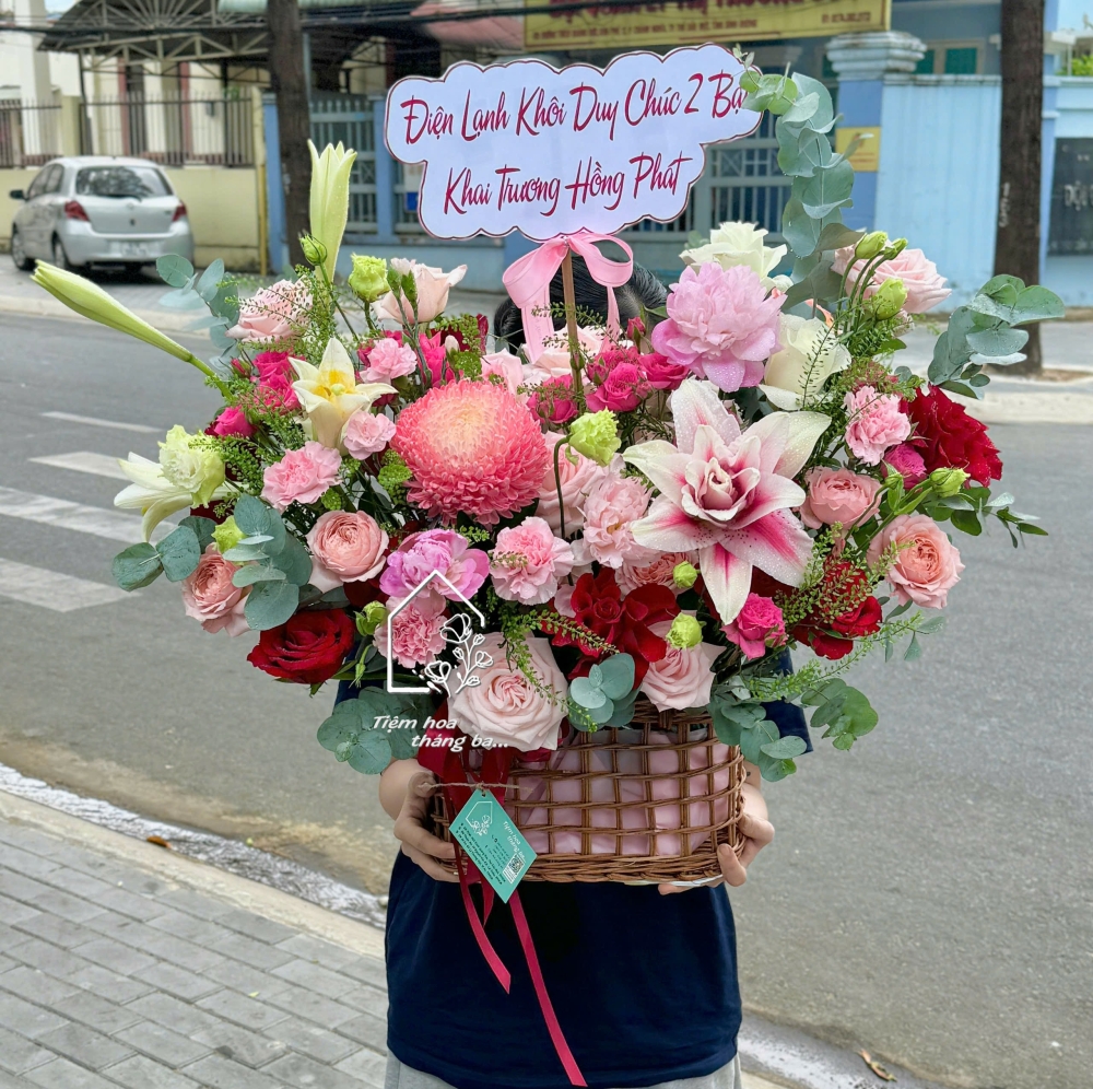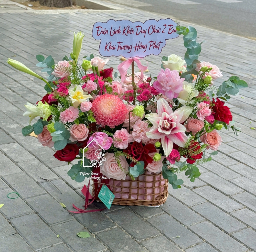 Giỏ hoa là sự kết hợp hài hòa giữa sắc đỏ nồng nàn và sắc hồng dịu dàng – tạo nên tổng thể vừa thu hút vừa ấm áp. Những đóa hoa ly bung nở đầy sức sống, hoa hồng mềm mại, điểm thêm cúc mẫu đơn và các loại hoa phụ xinh xắn… tất cả hòa quyện tạo nên một bố cục đầy đặn, sang trọng.