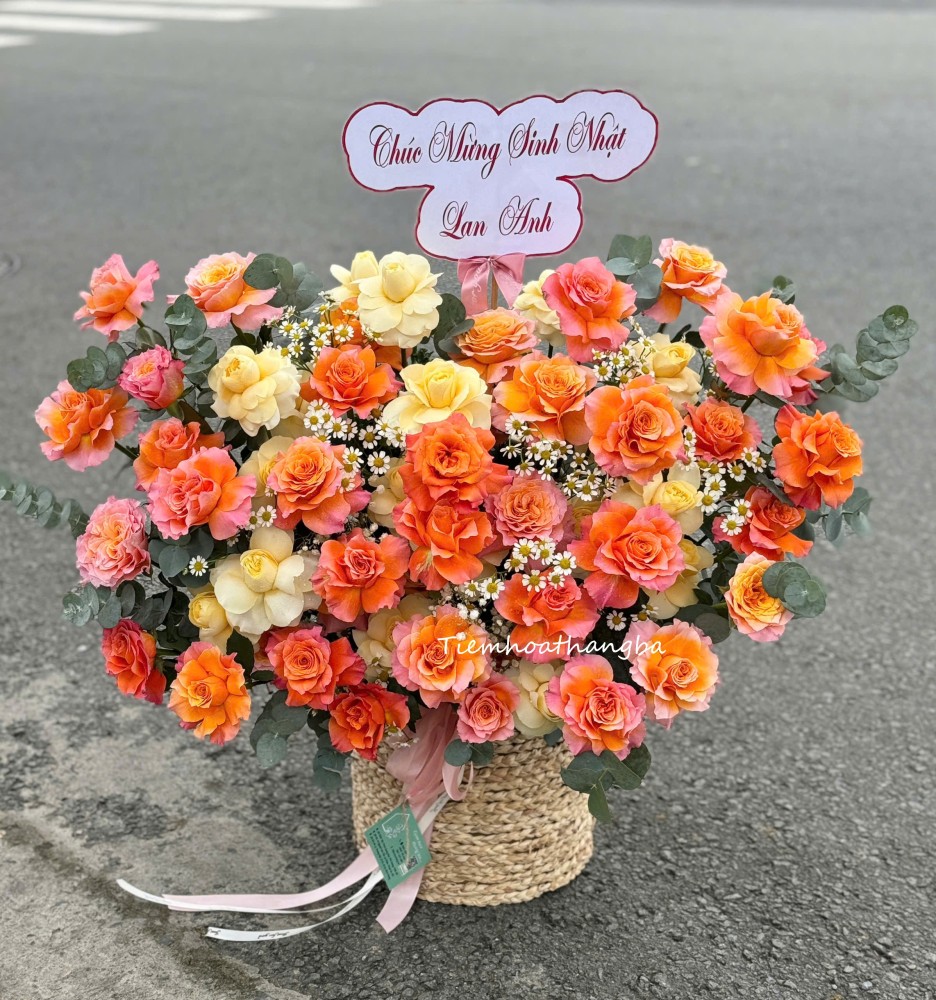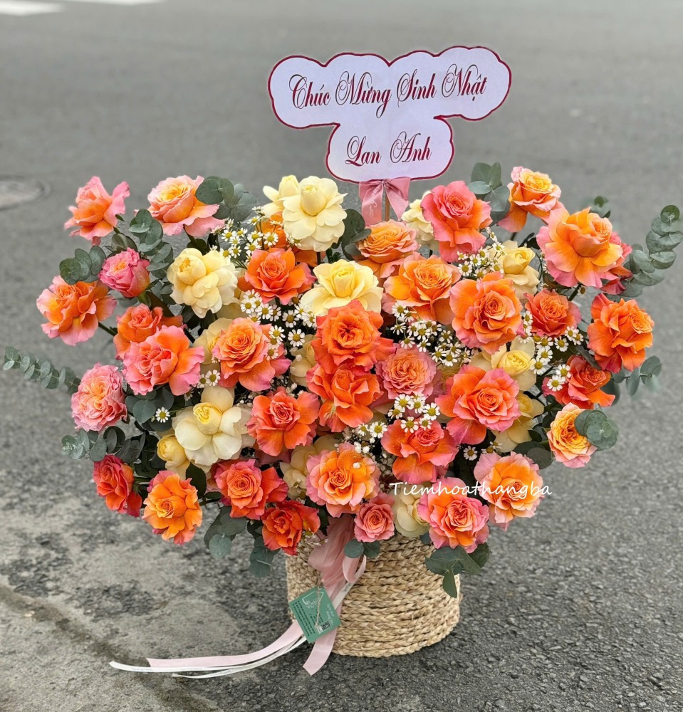 Giỏ hoa rực rỡ với sắc cam – vàng ấm áp từ hoa hồng cam spirit và hoa hồng vàng victo, mang đến không khí tươi vui, tràn đầy năng lượng, là món quà ý nghĩa gửi gắm lời chúc hạnh phúc và may mắn.