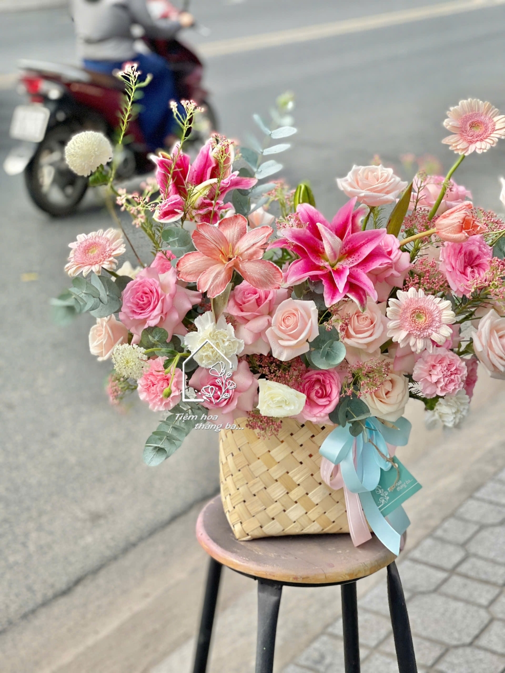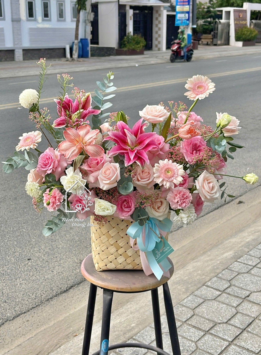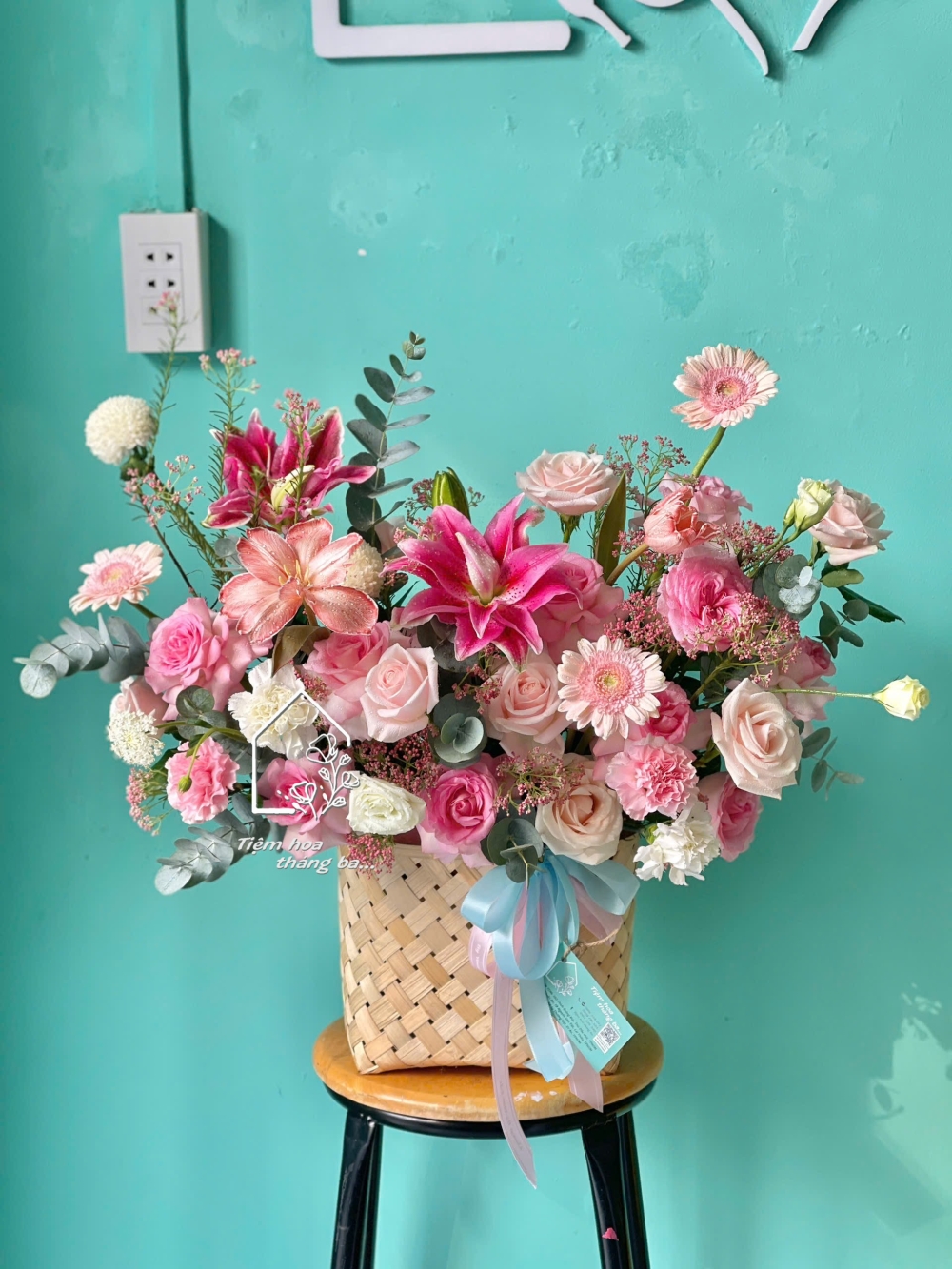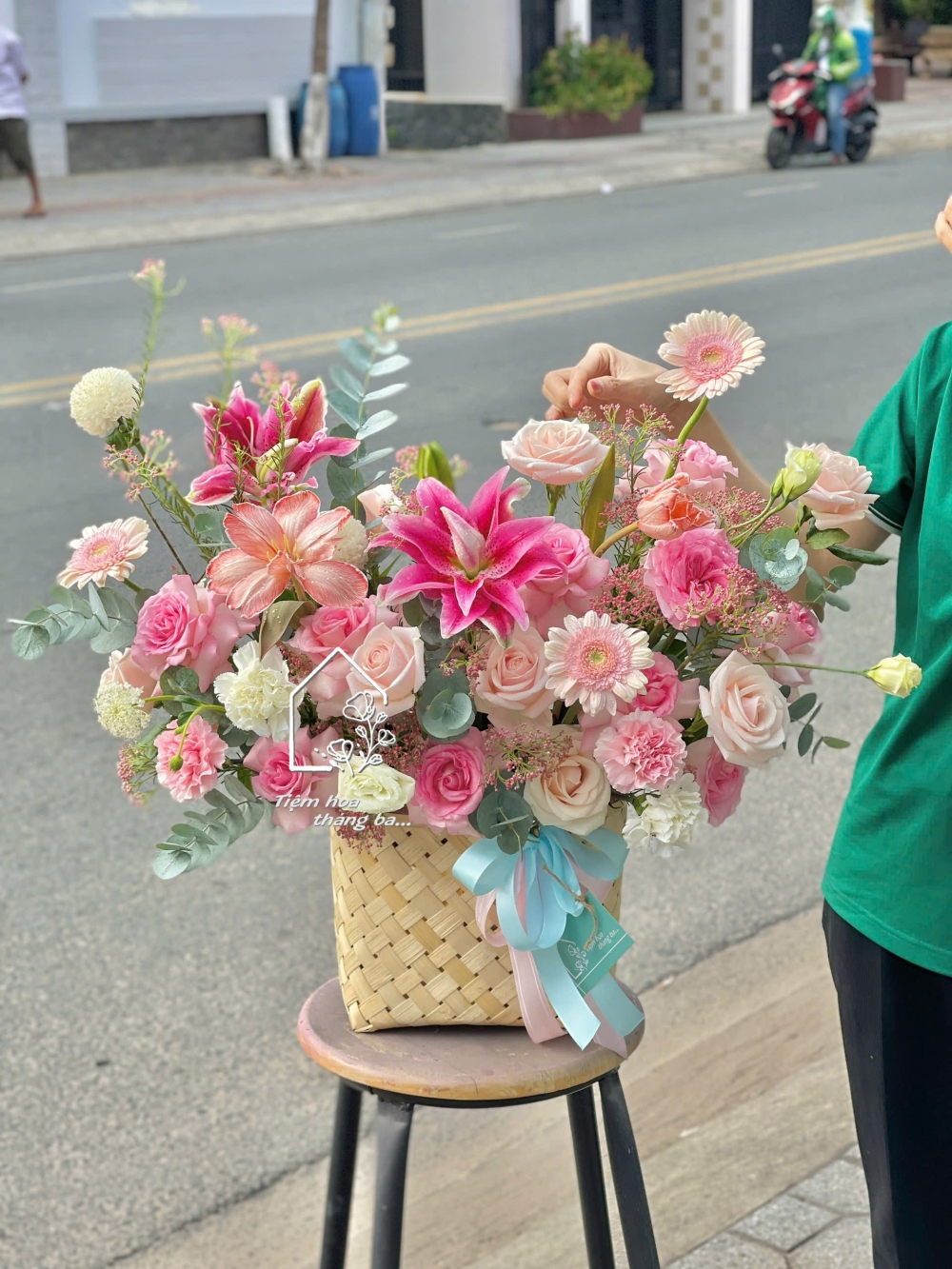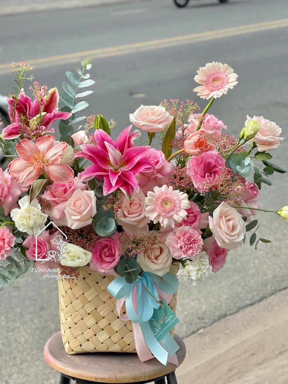 Giỏ hoa là sự kết hợp hài hòa giữa các sắc hồng ngọt ngào, trắng tinh khôi và điểm nhấn nổi bật từ hoa ly, tạo nên một tổng thể nhẹ nhàng nhưng đầy sức hút. Những bông hoa được sắp xếp theo phong cách garden tự nhiên, mang đến cảm giác mềm mại, bay bổng như một khu vườn nhỏ đầy hoa nở.