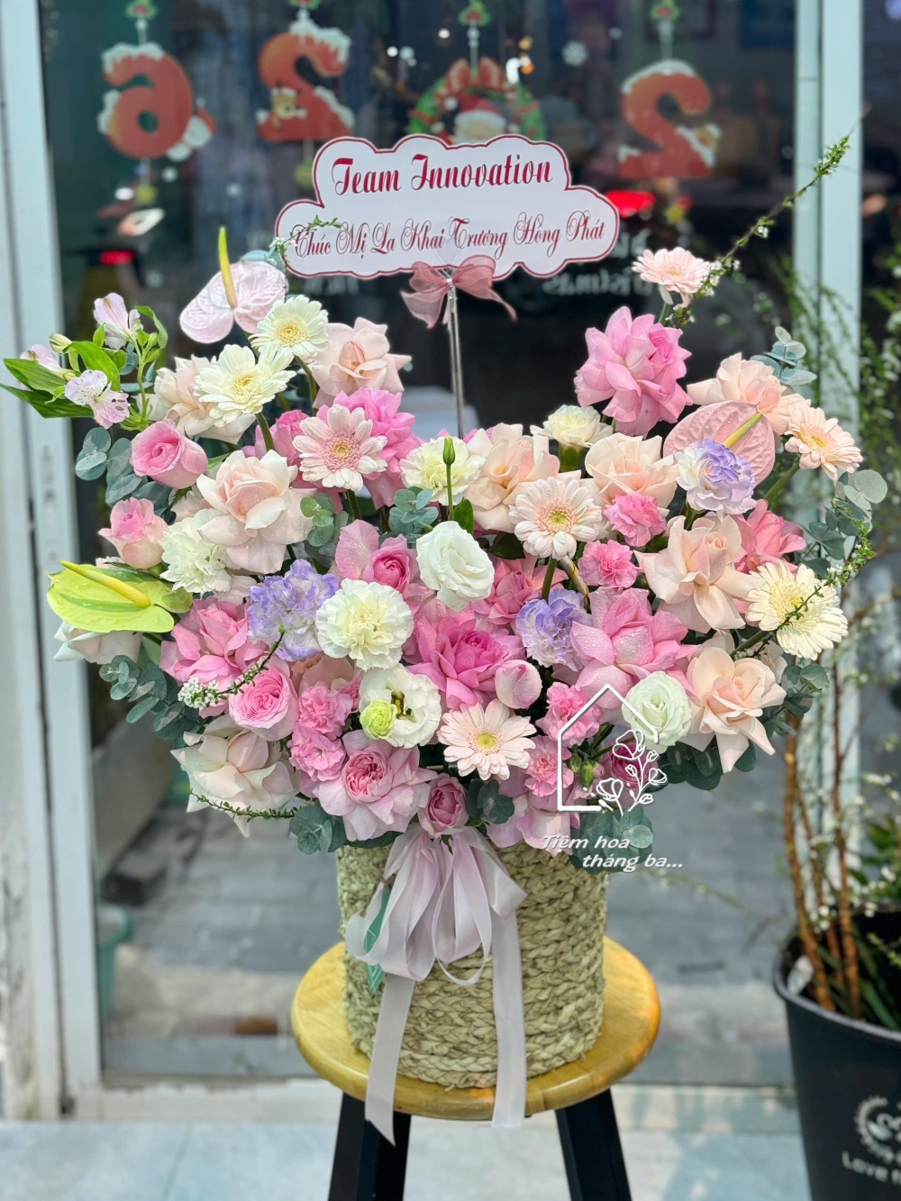 Giỏ hoa tone hồng pastel là sự kết hợp hài hòa giữa các sắc hồng ngọt ngào và hoa lá phụ thanh thoát, tạo nên tổng thể nhẹ nhàng nhưng vẫn sang trọng. Giỏ hoa được thiết kế tỉ mỉ, cân đối bố cục, mang đến cảm giác mềm mại và tinh tế ngay từ ánh nhìn đầu tiên.