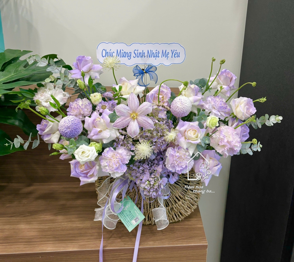Giỏ hoa tone tím mang vẻ đẹp dịu dàng, lãng mạn và sang trọng, được kết hợp hài hòa từ các loài hoa tươi như hồng tím, cát tường, tú cầu, tulip… Thiết kế tinh tế, phù hợp làm quà tặng sinh nhật, kỷ niệm, chúc mừng hay gửi gắm những yêu thương chân thành.