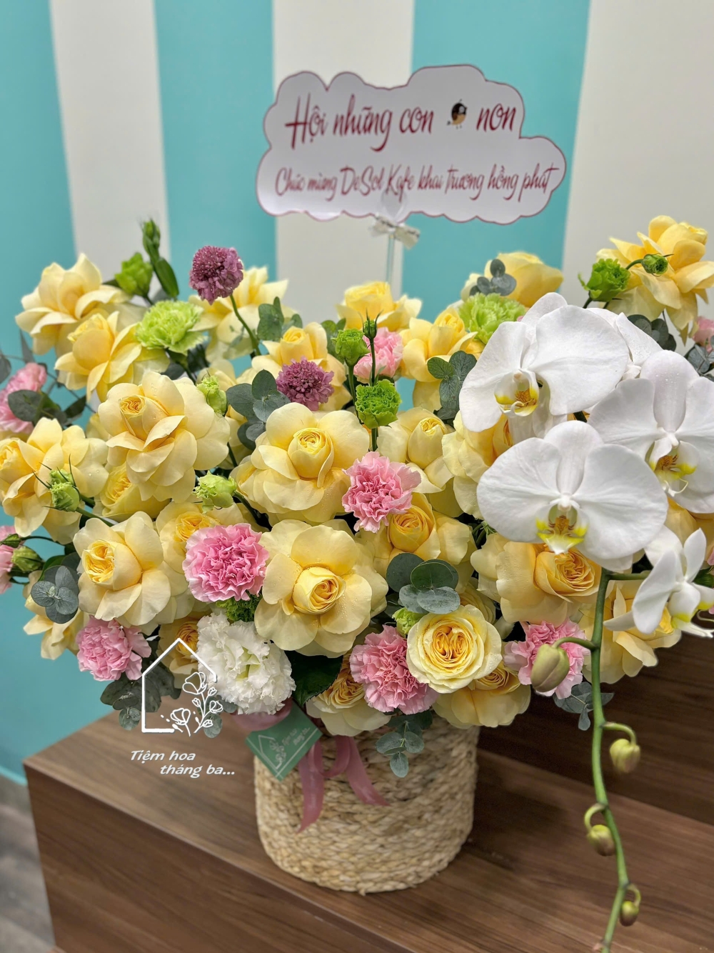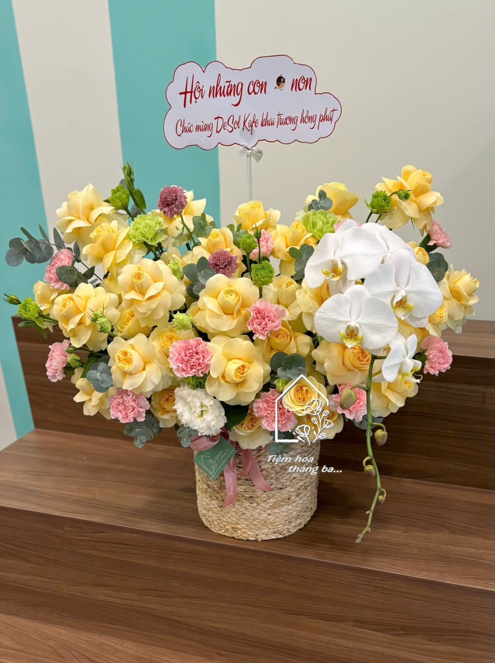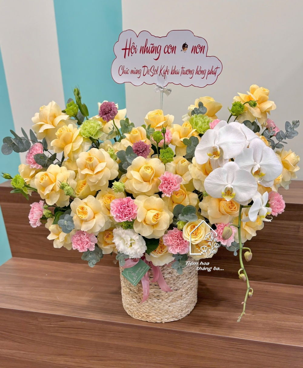 Giỏ hoa được kết hợp từ các loại hoa tươi cao cấp như hoa hồng vàng victo,cẩm chướng hồng pastel cùng lan hồ điệp trắng và hoa lá phụ trang trí được tuyển chọn kỹ lưỡng. Mỗi bông hoa đều đảm bảo độ tươi mới, màu sắc trong trẻo, được sắp xếp khéo léo để tạo bố cục cân đối và tự nhiên.