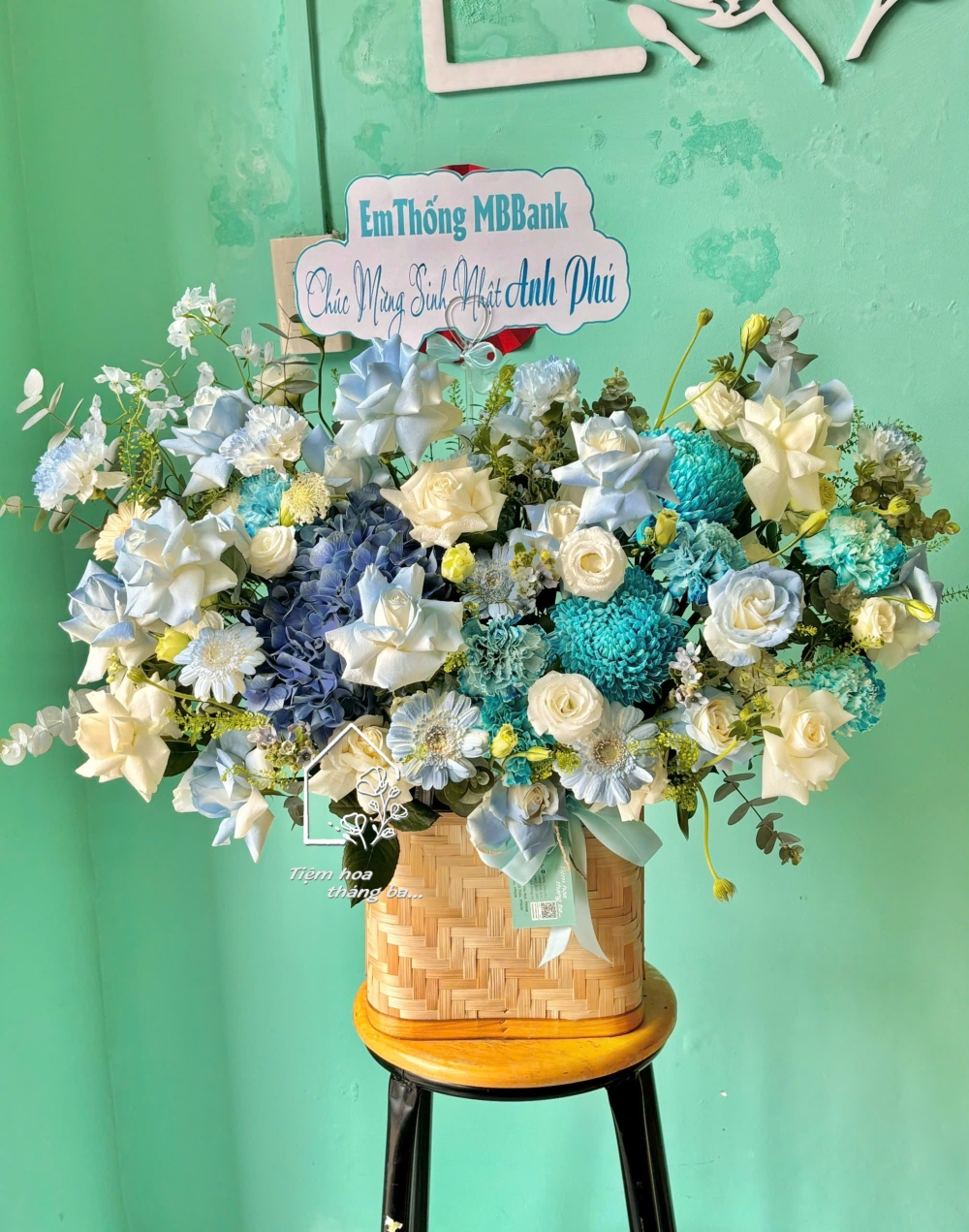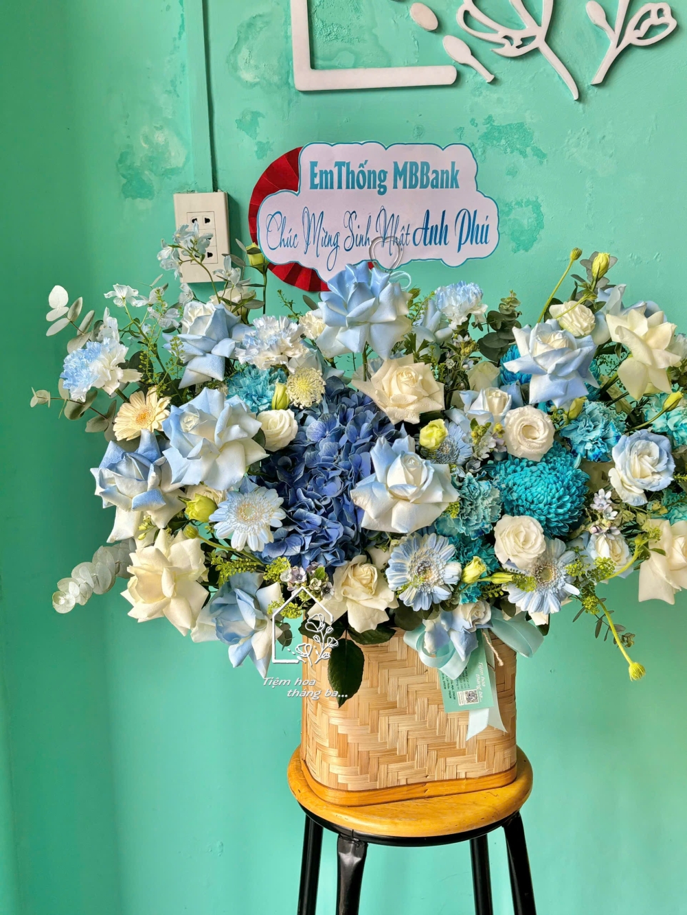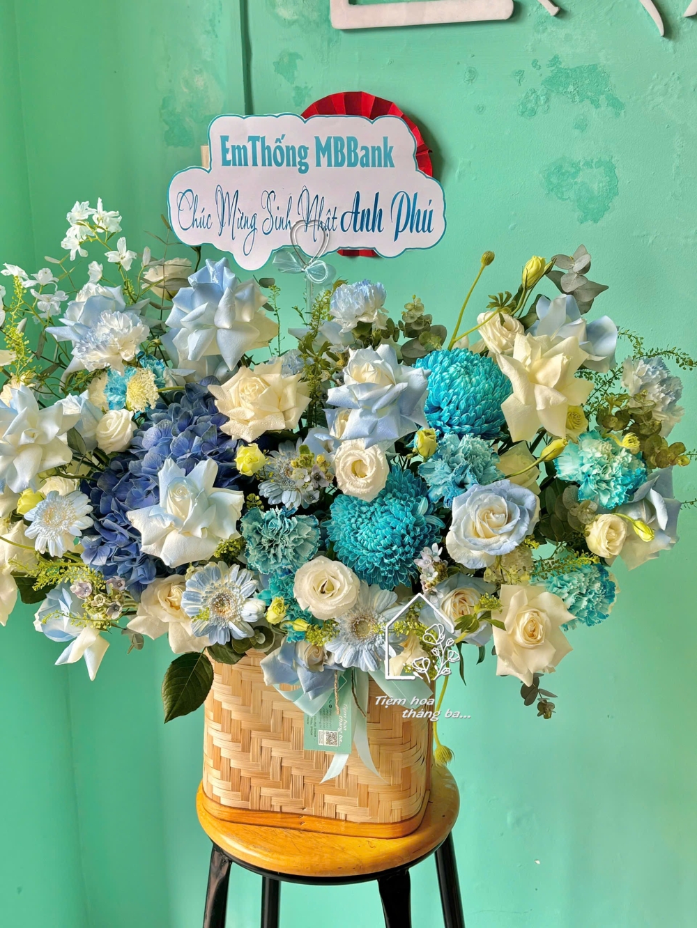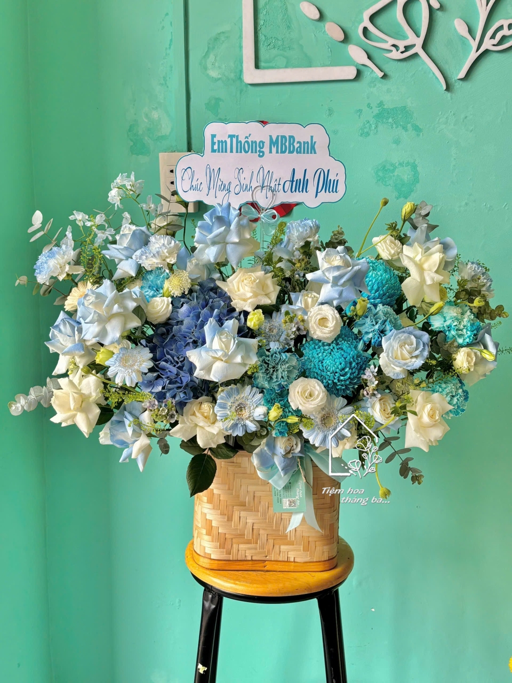 Giỏ hoa tone xanh dương là sự kết hợp hài hòa giữa các gam màu mát dịu, tạo cảm giác thanh lịch – hiện đại – đầy thiện cảm. Tone xanh tượng trưng cho sự tin cậy, hy vọng và phát triển bền vững; trong khi sắc trắng mang ý nghĩa tinh khôi, trang nhã và chân thành.