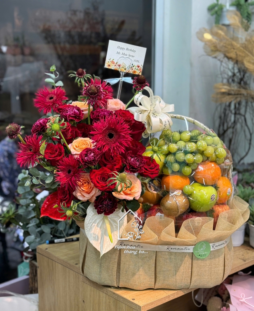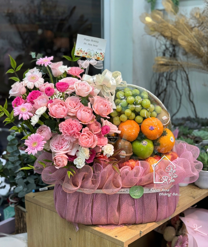 Giỏ hoa tươi và trái cây là một thiết kế tinh tế từ Tiệm Hoa Tháng Ba không chỉ là món quà, mà là thông điệp của sự quan tâm và yêu thương