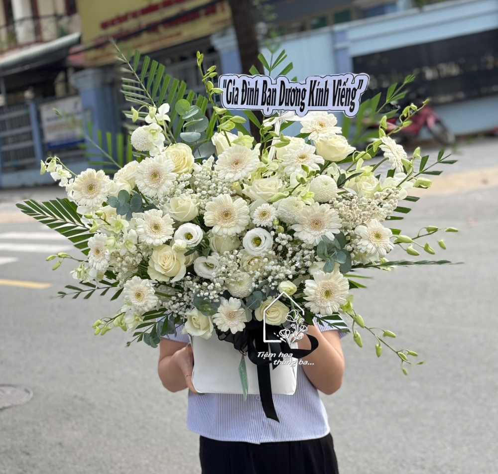 Giỏ hoa viếng được kết hợp tinh tế từ hoa hồng trắng, đồng tiền, lan thái, cát tường và baby trắng, mang sắc thái nhẹ nhàng, thanh khiết. Một món quà tiễn biệt đầy trang trọng, thể hiện sự trân trọng và sẻ chia sâu sắc đến gia quyến người đã khuất.