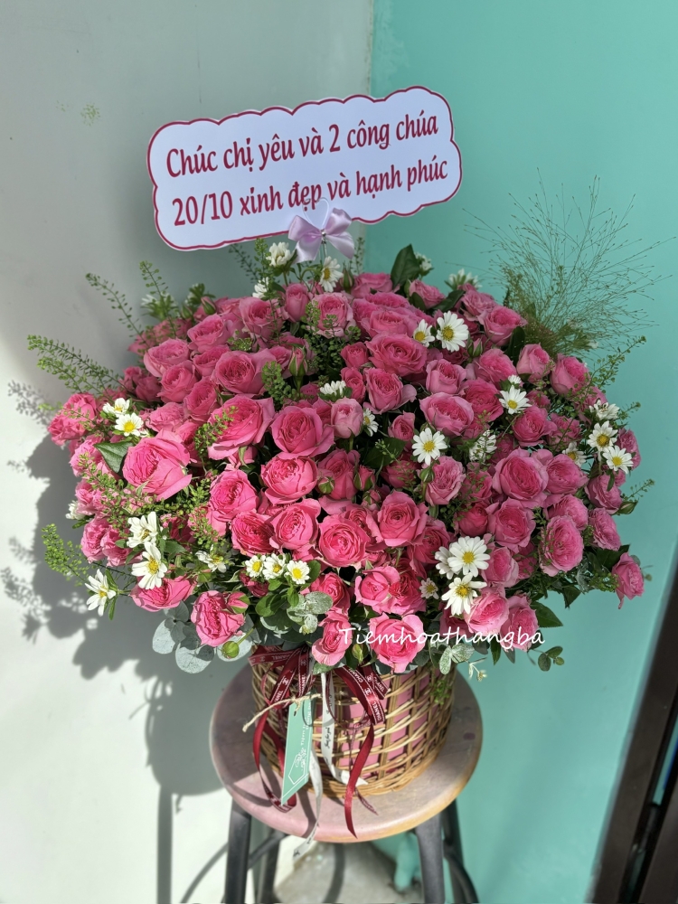 Không cần quá cầu kỳ, đôi khi chỉ một giỏ hồng chùm sophia mix cúc nhật nhí cũng đủ khiến trái tim người nhận rung động. Từng bông hồng chùm sophia khoe sắc hồng phấn nhẹ nhàng – biểu tượng của tình yêu chân thành và sự trân quý. Xen kẽ là những nhánh cúc nhật nhí nhỏ xinh cùng hoa lá phụ tựa như niềm vui giản đơn và trong trẻo của cuộc sống.