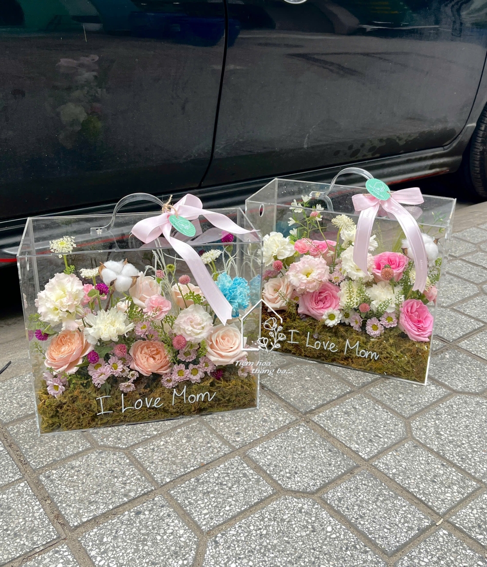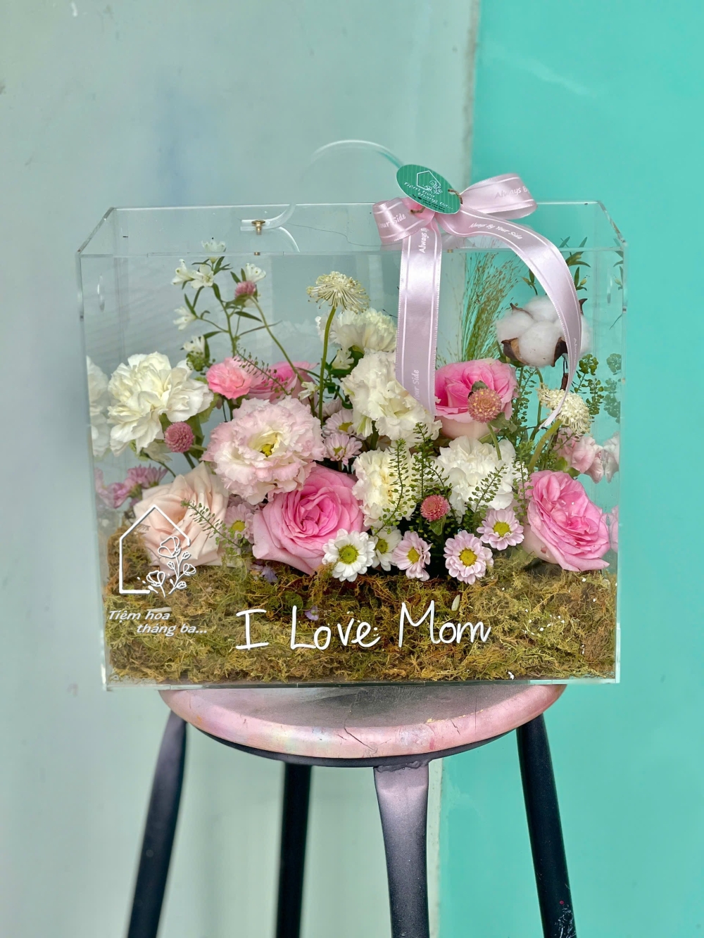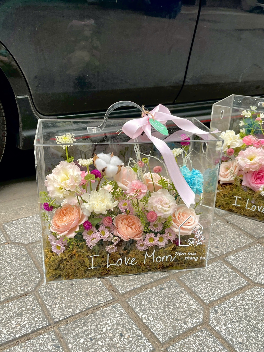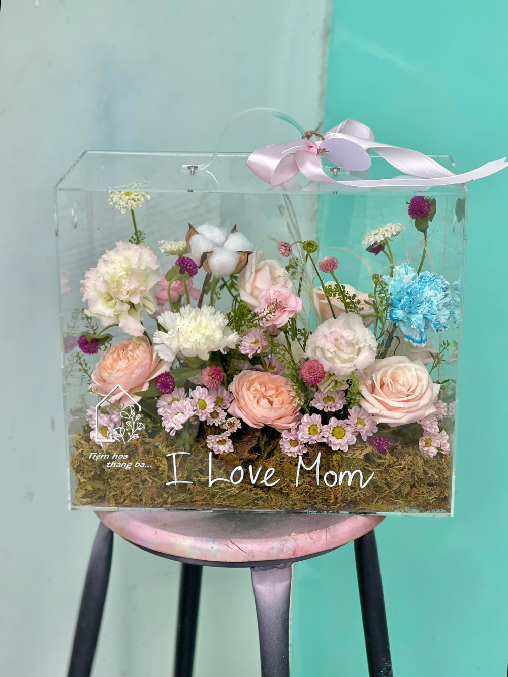 Hộp hoa mica gây ấn tượng bởi thiết kế trong suốt hiện đại, giúp tôn lên vẻ đẹp mềm mại và tự nhiên của từng bông hoa bên trong. Các loại hoa tươi tone pastel như hoa hồng, cẩm chướng, cúc nhí được phối hài hòa trên nền rêu xanh, tạo nên tổng thể nhẹ nhàng, tươi mới và đầy cảm xúc.
