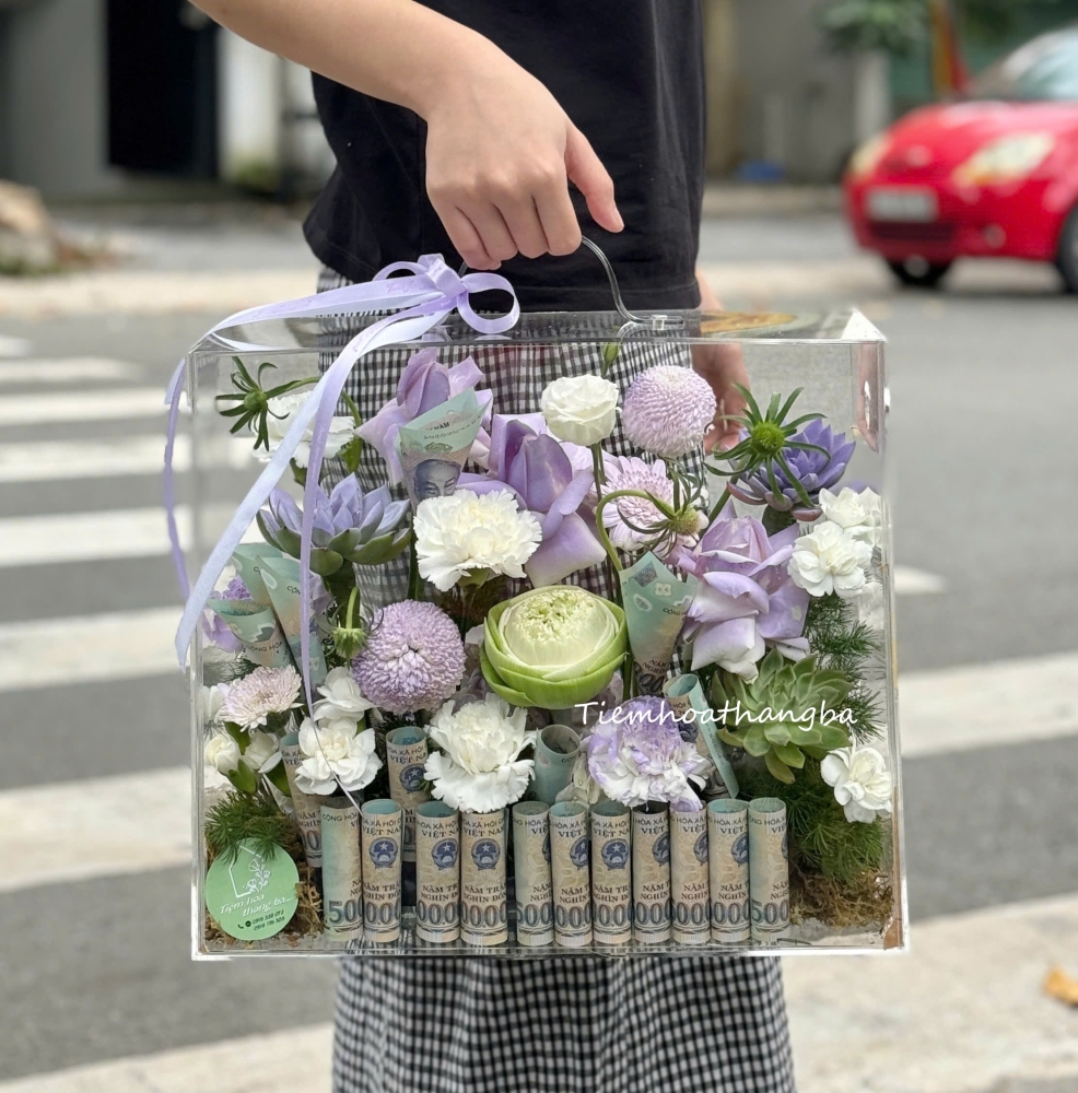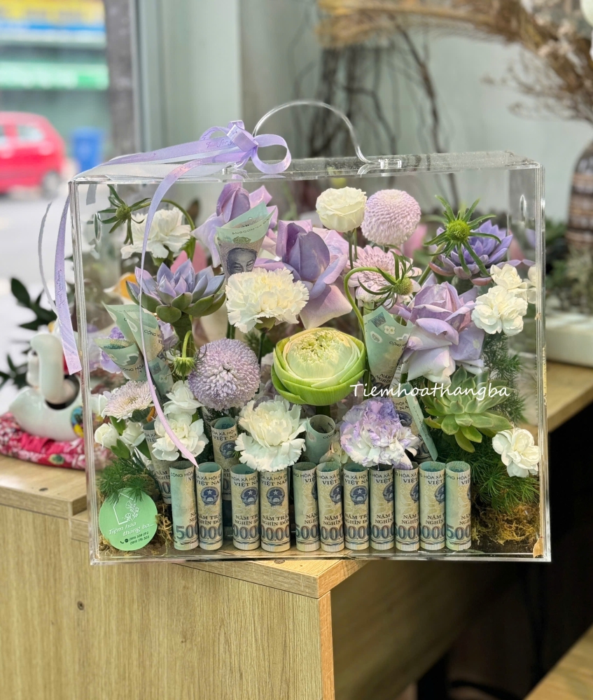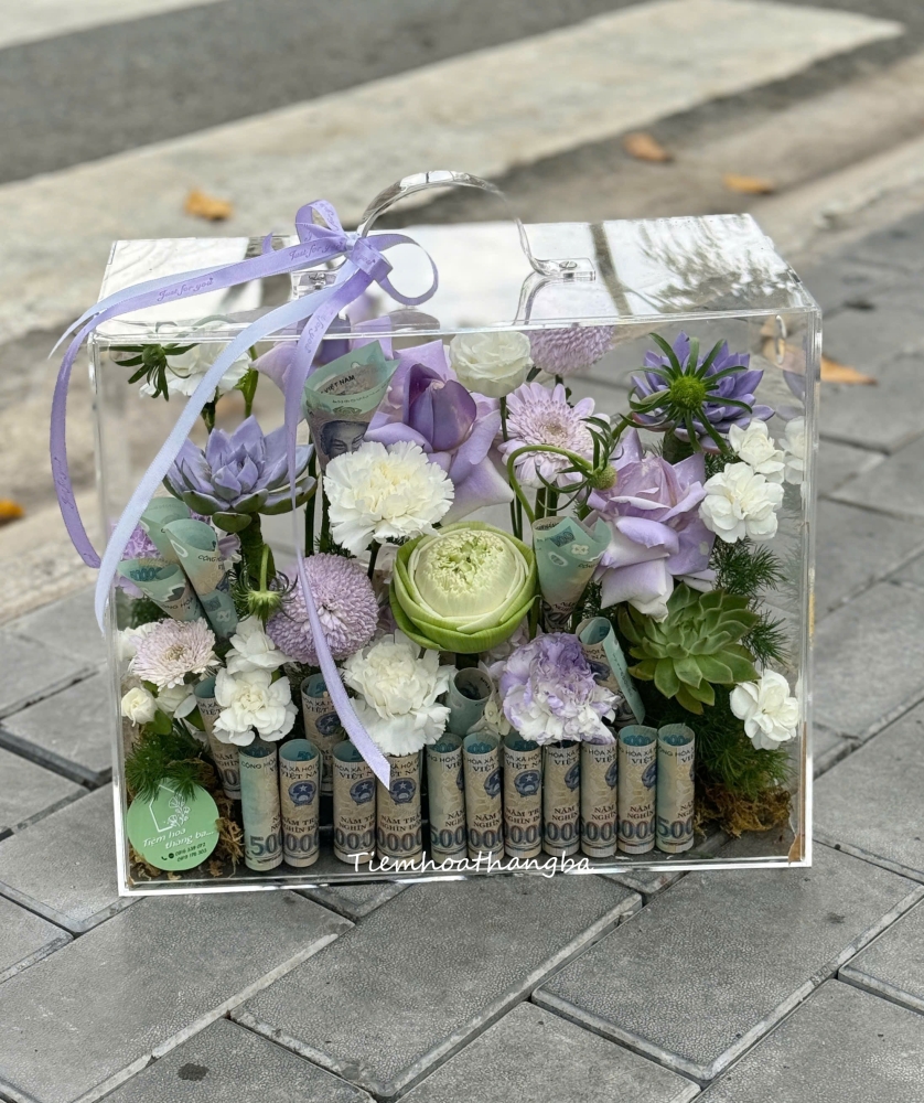 Hộp hoa mica thực hiện tỉ mỉ với tone tím – trắng pastel nhẹ nhàng, tượng trưng cho sự thanh lịch, tinh tế và tình cảm chân thành. Hộp mica trong suốt giúp tôn lên vẻ đẹp nổi bật của hoa tươi như sen đá, hồng tím, sen trắng, cẩm chướng và những tờ tiền thật cuộn tròn khéo léo – vừa mang giá trị vật chất, vừa gửi gắm lời chúc may mắn, tài lộc và hạnh phúc viên mãn.