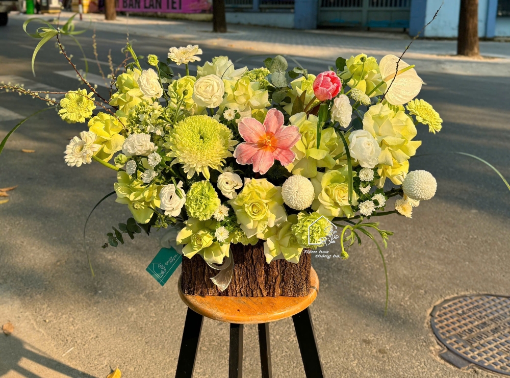Phần hộp hoa được làm từ gỗ tự nhiên, tạo cảm giác mộc mạc nhưng cao cấp, rất phù hợp với không gian văn phòng, showroom, cửa hàng hoặc sự kiện. Thiết kế dáng ngang hiện đại, bố cục mở giúp giỏ hoa luôn tươi tắn và thu hút ánh nhìn từ mọi góc độ.