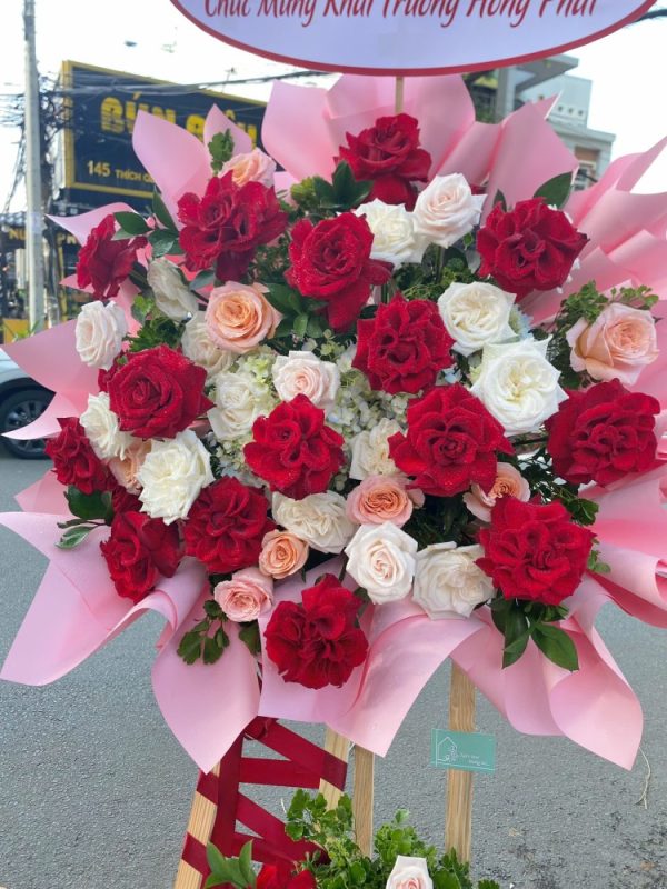 Kệ hoa chúc mừng được thiết kế từ những đóa hồng đỏ quyến rũ xen lẫn sắc trắng tinh khôi và hồng pastel nhẹ nhàng, thay lời chúc khai trương Hồng Phát: “Khai môn đại cát – Phát tài như ý”.