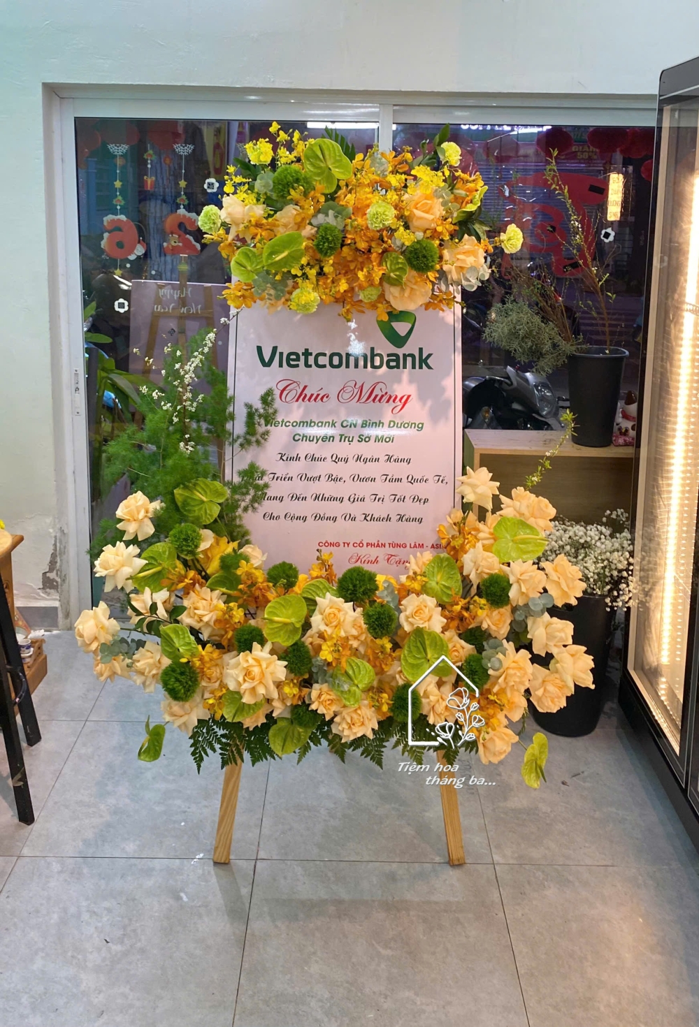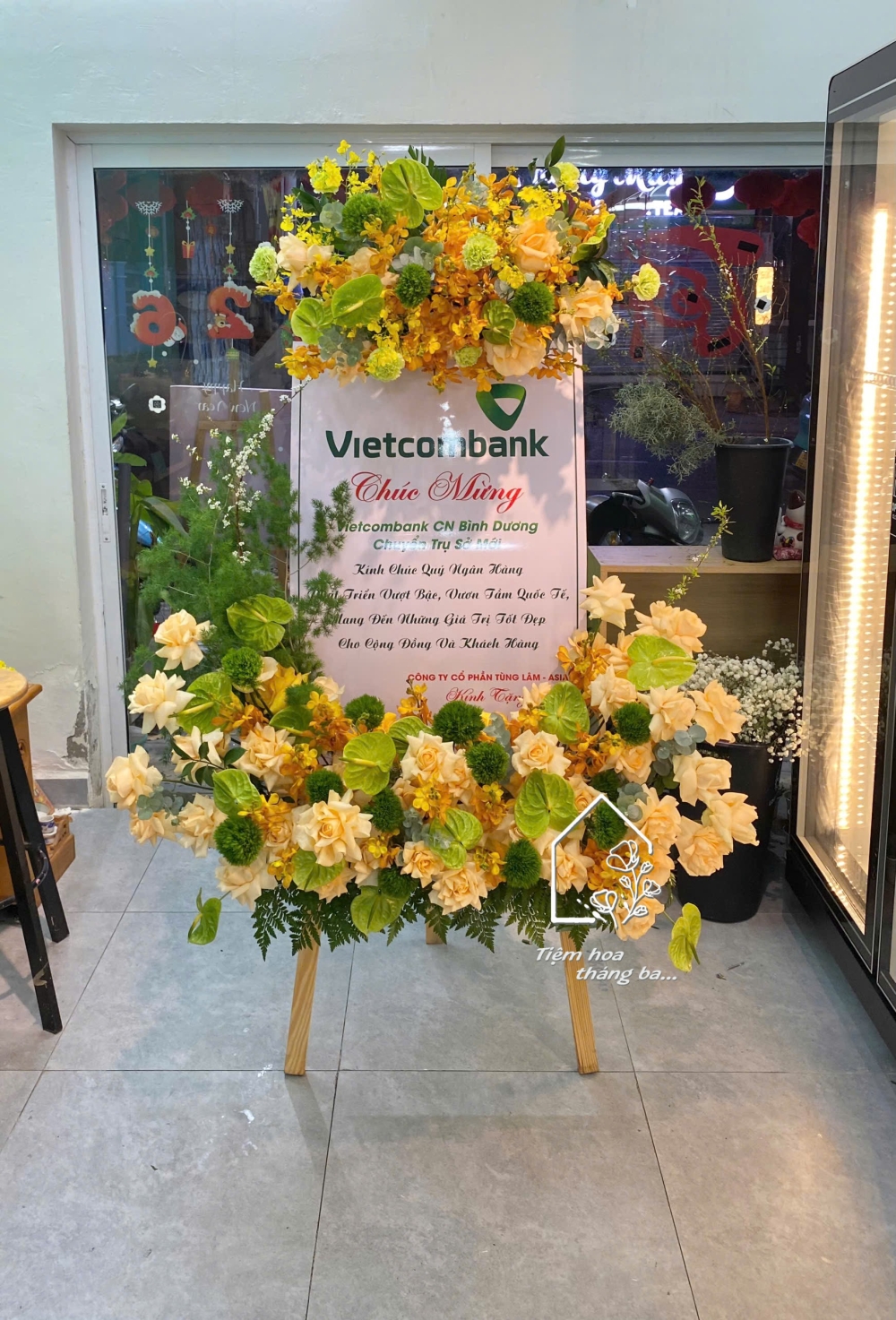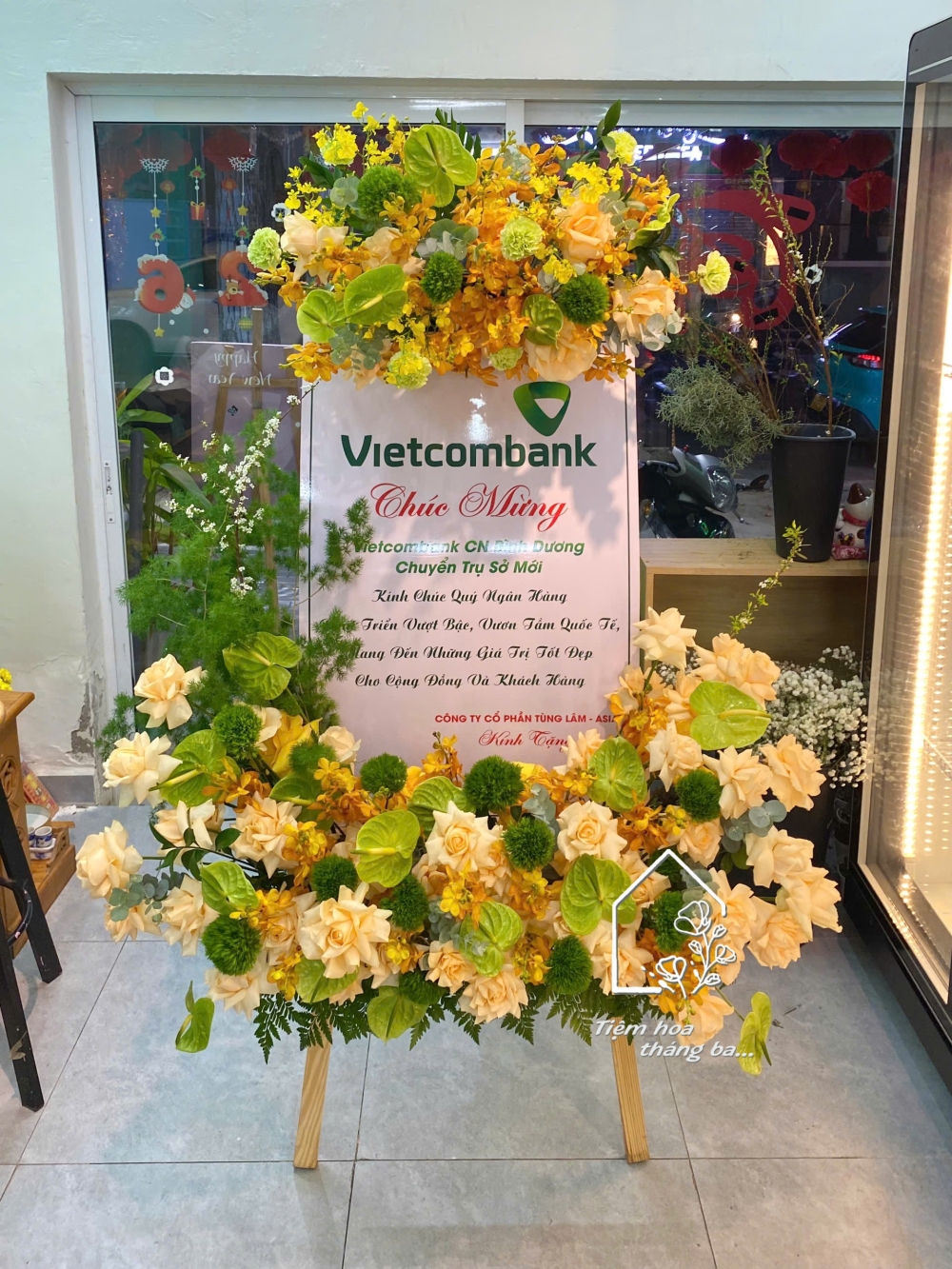 Kệ hoa chúc mừng tone vàng cam là mẫu kệ hoa cao cấp được thiết kế riêng cho các dịp trọng đại như khai trương chi nhánh, hội nghị khách hàng, khánh thành văn phòng, lễ kỷ niệm và các sự kiện doanh nghiệp.