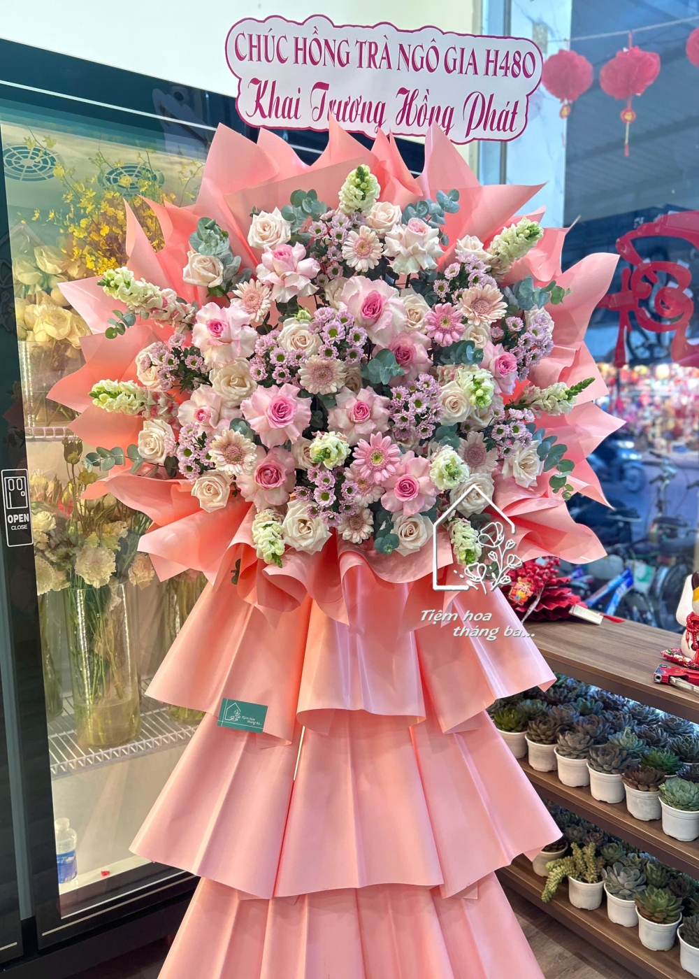 Kệ hoa khai trương hồng pastel là lựa chọn hoàn hảo dành cho những ai yêu thích vẻ đẹp nhẹ nhàng, tinh tế nhưng vẫn nổi bật và trang trọng trong ngày khai trương.