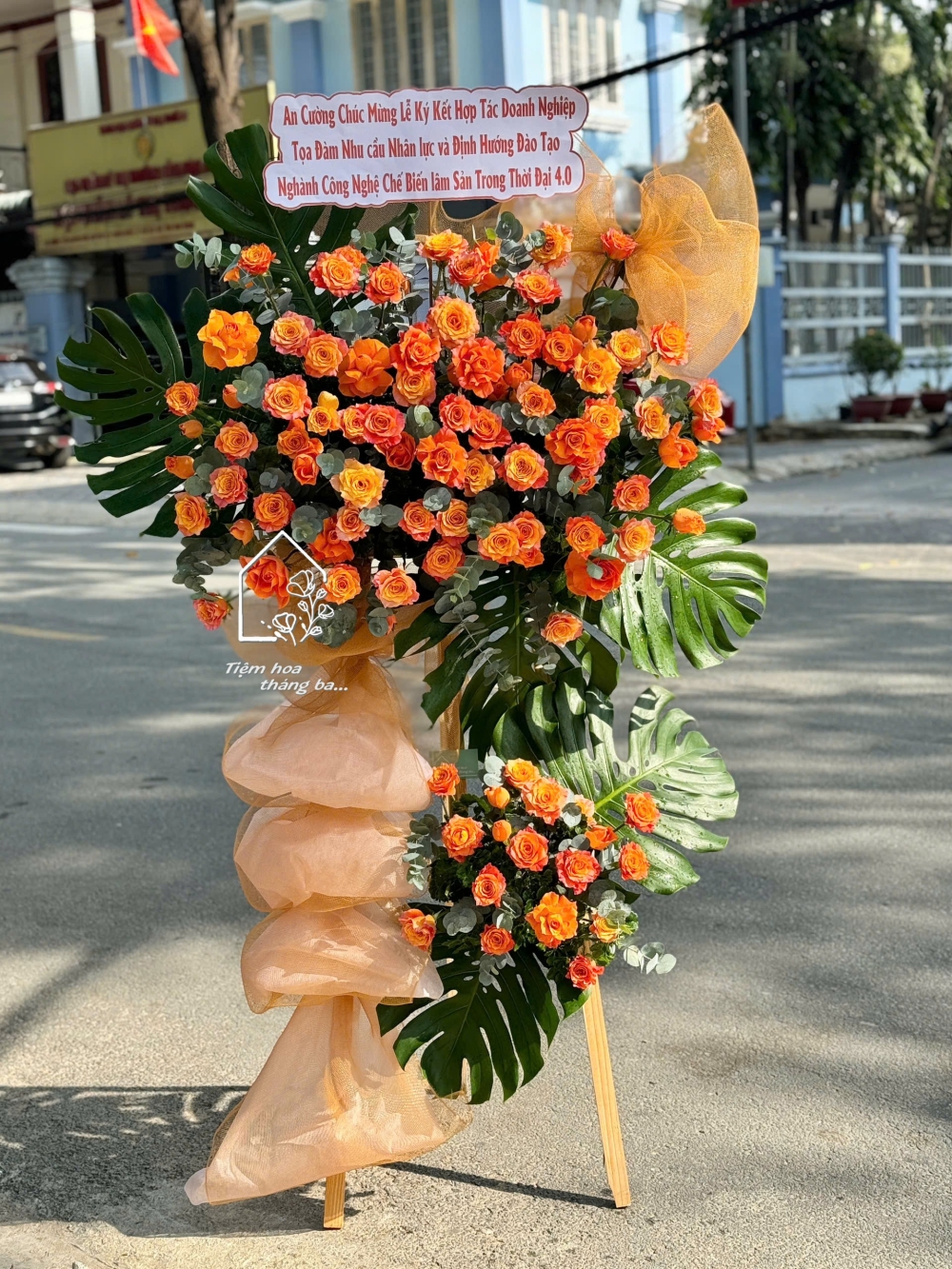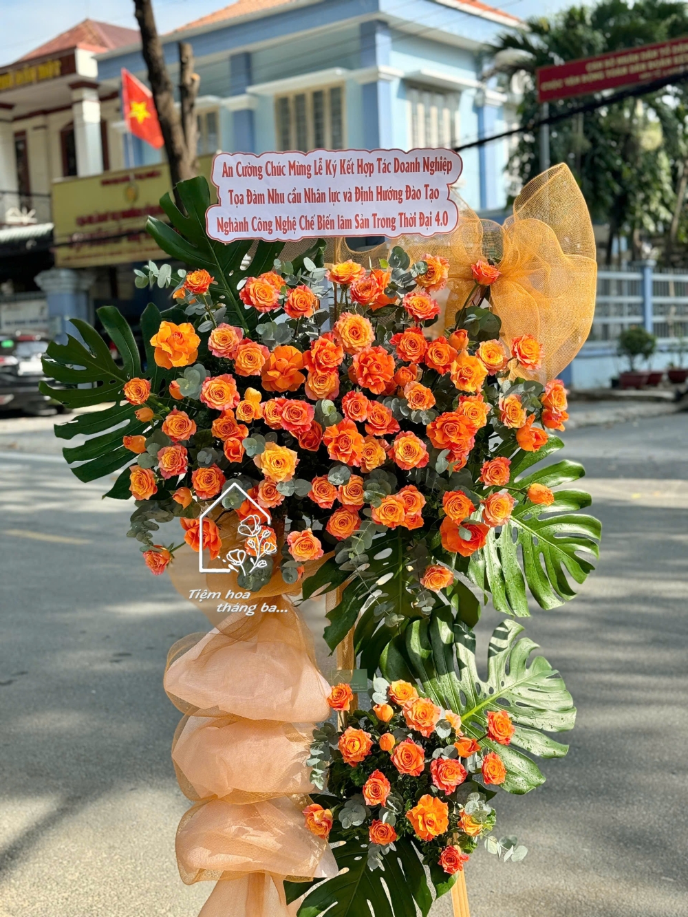 Kệ hoa khai trương tone cam nổi bật với sắc hoa rực rỡ, mang năng lượng tích cực và tinh thần bứt phá. Thiết kế sử dụng hoa tươi cao cấp cam spirit phối cùng lá trầu bà xanh tạo nên tổng thể hài hòa – nổi bật – thu hút mọi ánh nhìn.