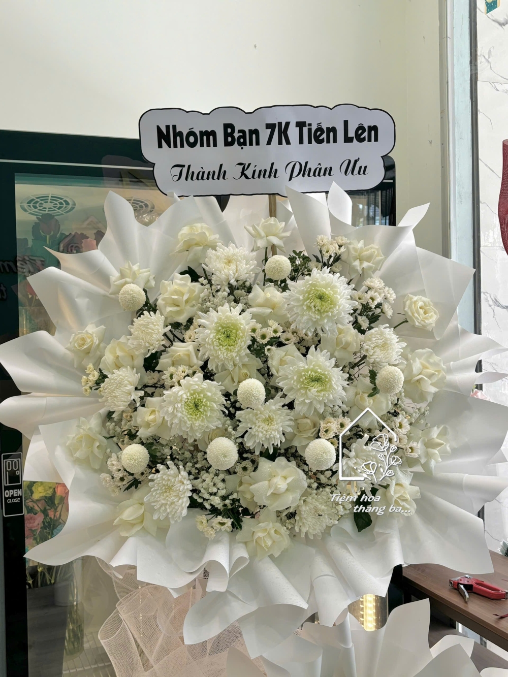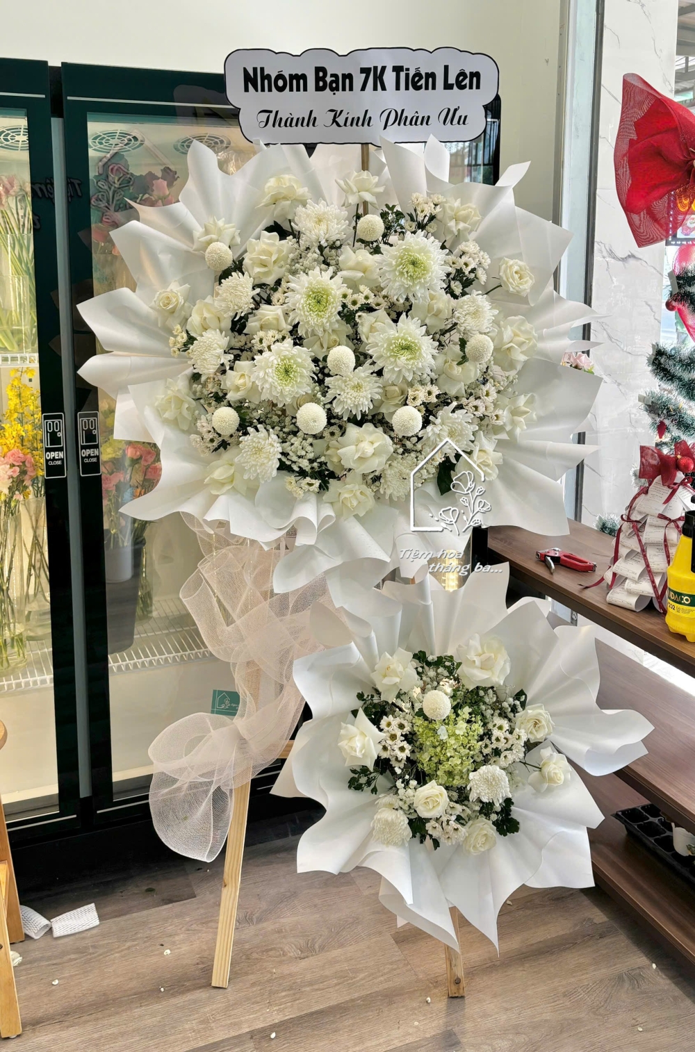 Kệ hoa viếng tone trắng được thiết kế theo phong cách trang nhã, tinh tế, thể hiện sự kính trọng và lòng thành kính trong những giây phút tiễn biệt. Sắc trắng chủ đạo tượng trưng cho sự thanh khiết, bình an và lời chia buồn nhẹ nhàng, giúp truyền tải trọn vẹn sự cảm thông và sẻ chia đến gia quyến.