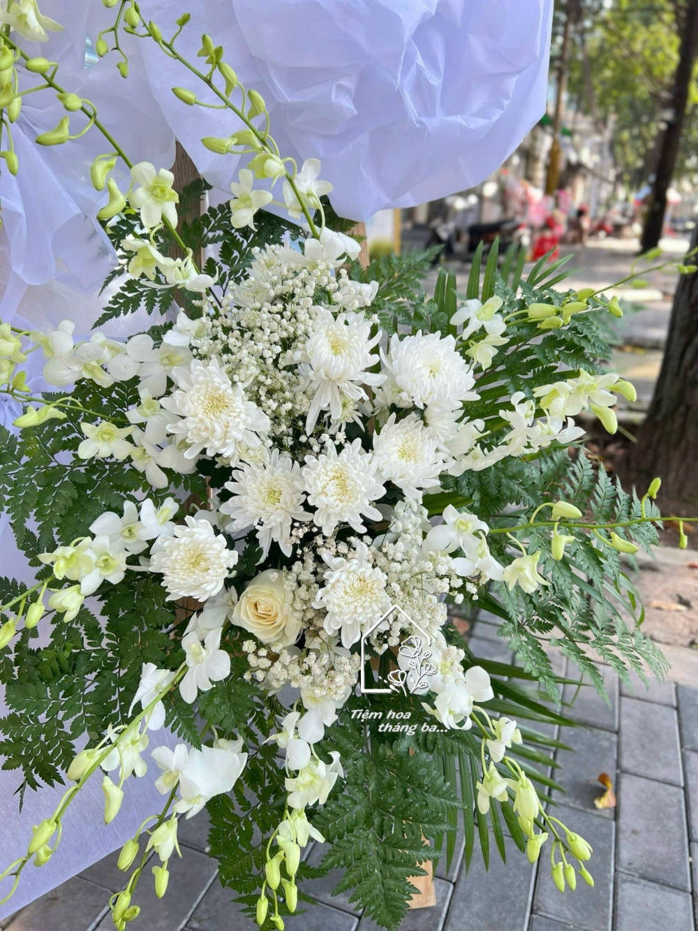 Kệ hoa viếng tone trắng mang vẻ đẹp trang trọng và tinh tế, là lựa chọn lý tưởng để thể hiện sự tiếc thương và lòng thành kính trong tang lễ. Tone trắng chủ đạo – biểu tượng của sự thuần khiết, yên bình – được phối hợp hài hòa giữa hồng trắng, cúc trắng, lan trắng và các loại hoa điểm nhẹ nhàng, tạo nên tổng thể thanh thoát nhưng vẫn đầy sâu lắng.