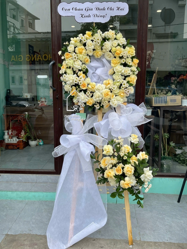 Kệ Hoa Viếng Tone Trắng Vàng – Lời Chia Buồn Trang Trọng