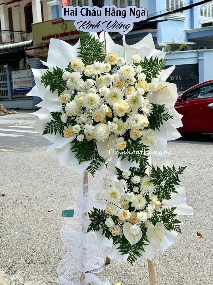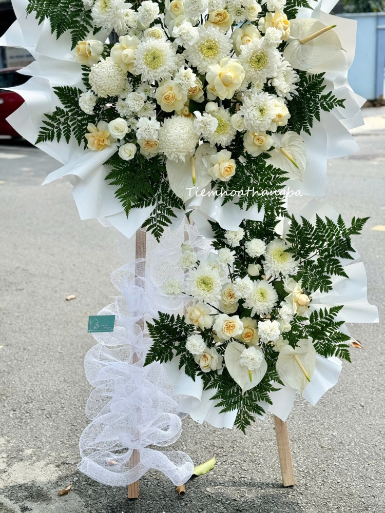 Kệ hoa được thiết kế với bố cục cân đối, sử dụng những loài hoa như cúc mẫu đơn, hoa hồng trắng, hồng môn, hoa hồng vàng, lá phụ xanh tự nhiên,… Mỗi chi tiết đều được cắm tỉ mỉ để tôn lên vẻ đẹp trang nhã, tinh tế, phù hợp cho các buổi lễ tang trang trọng.