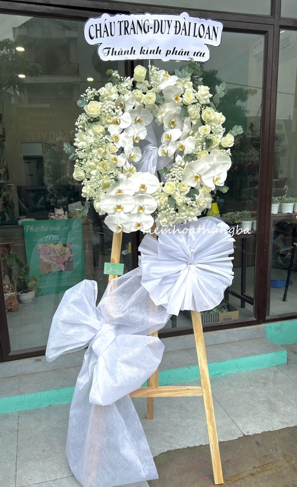 Trong những phút giây tiễn biệt, đôi khi lời nói trở nên vụn vỡ – và chính những đóa hoa lại thay ta gửi đi lời thương nhớ, lòng thành kính và sự chia sẻ chân thành nhất. Kệ hoa là sự kết hợp hài hòa giữa lan hồ điệp trắng tinh khôi, hoa hồng trắng nhẹ nhàng và baby trắng mỏng manh. Từng cánh hoa mang một ý nghĩa riêng – lan hồ điệp đại diện cho sự vĩnh hằng, hồng trắng tượng trưng cho niềm tiếc thương sâu sắc, còn baby trắng là hình ảnh của sự thanh thản, lời cầu nguyện cho linh hồn người đã khuất được yên nghỉ nơi vĩnh hằng.
