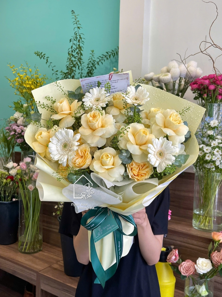 Tiệm có nhận thiết kế hoa tươi theo yêu cầu, bạn có thể cho tiệm biết bạn cần đặt hoa cho dịp gì, tông màu bạn muốn là gì, ngân sách của bạn ra sao, tiệm sẽ thiết kế theo yêu cầu của bạn nhé! Tiệm miễn phí thiết kế banner, thiệp mừng, tiệm giao hoa tận nơi, miễn ship đơn từ 500k bán kính 5km.
