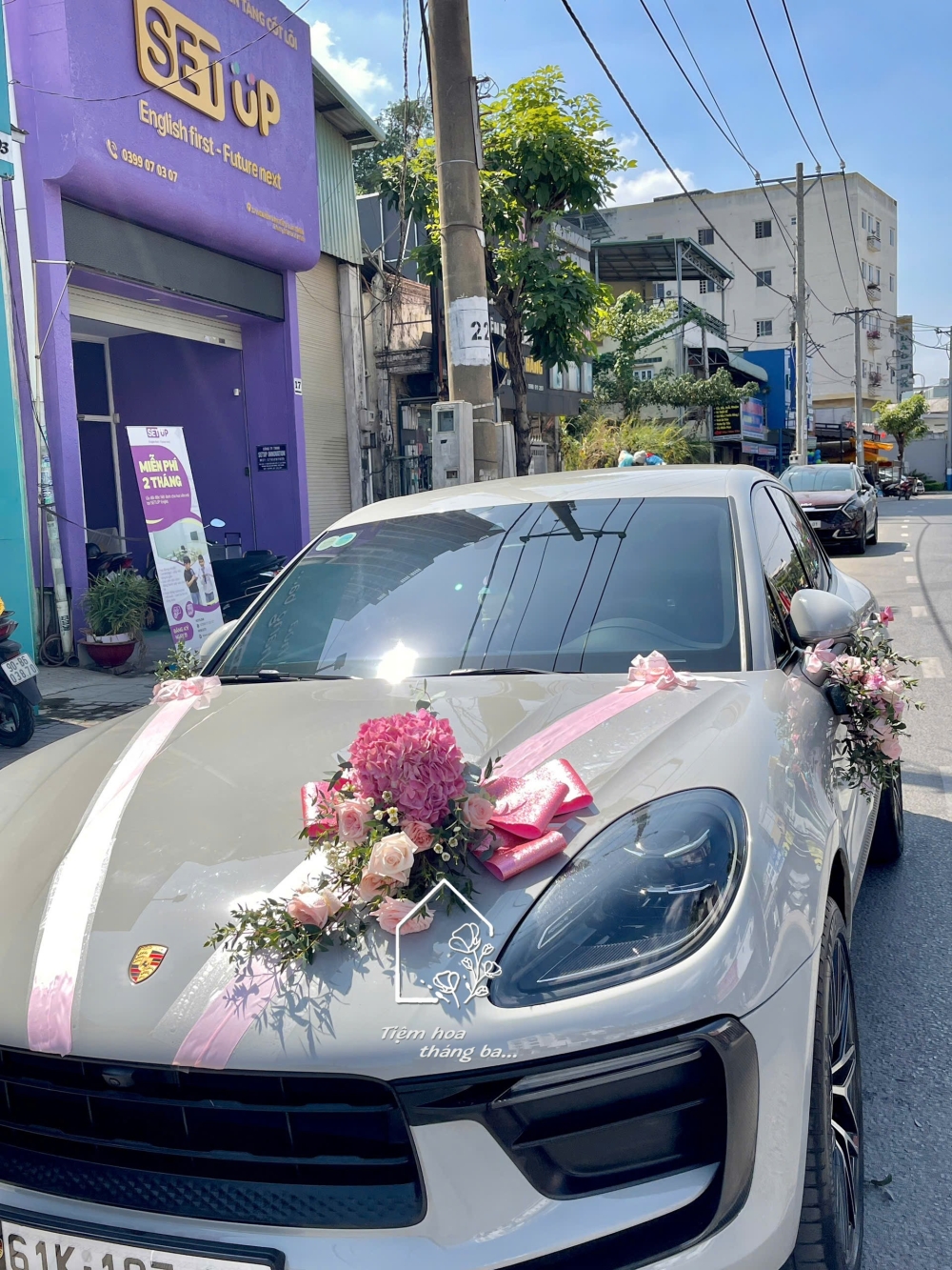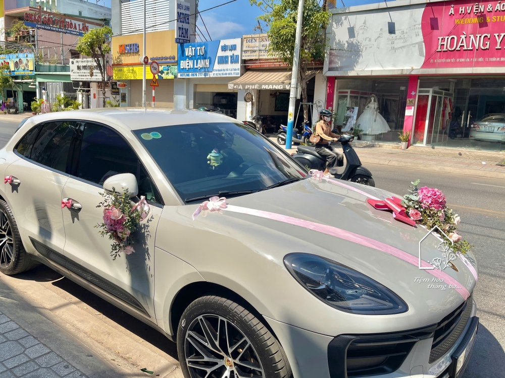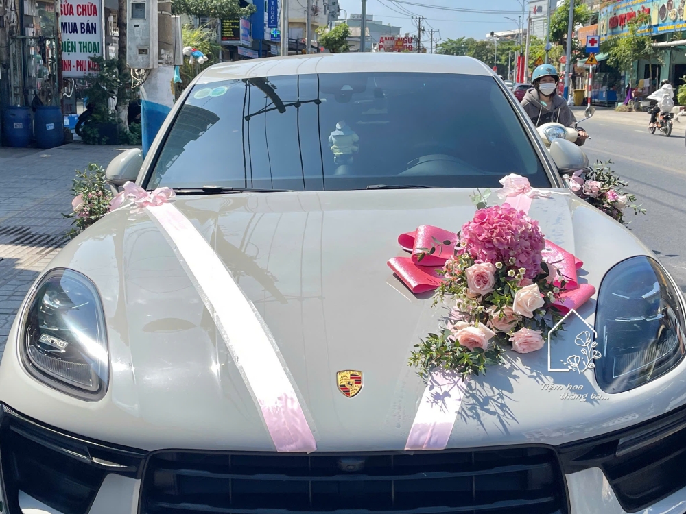 Xe hoa cưới tone hồng pastel nhẹ nhàng, kết hợp hoa cẩm tú cầu hồng nhập khẩu, hoa hồng ohara và lá xanh tự nhiên. Thiết kế tinh tế, sang trọng, phù hợp trang trí xe rước dâu, xe cô dâu – chú rể trong ngày cưới.